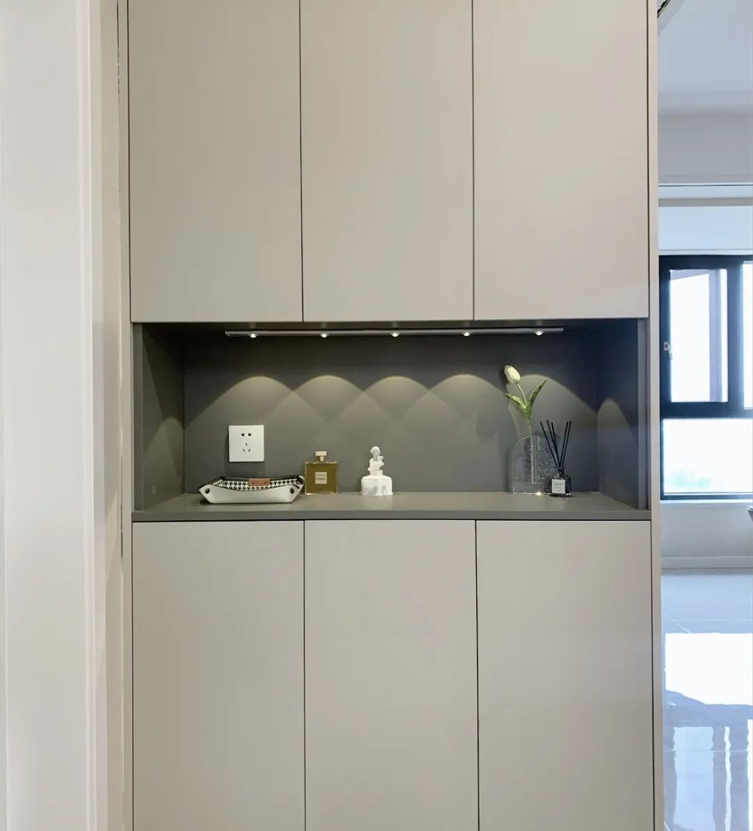 不仅餐边柜,玄关柜也装了。感应式的太方便了,每次一进门就自动亮起,人走后又自动熄灭,科技感十足,来家的客人都说好使。