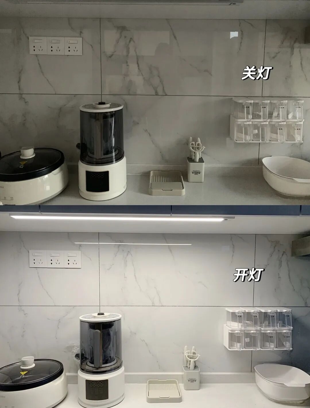 看这个有感应灯和没感应灯的对比图,真的太明显了,尤其家里经常是老人做饭的,装上这种灯带,体验感会好很多。
