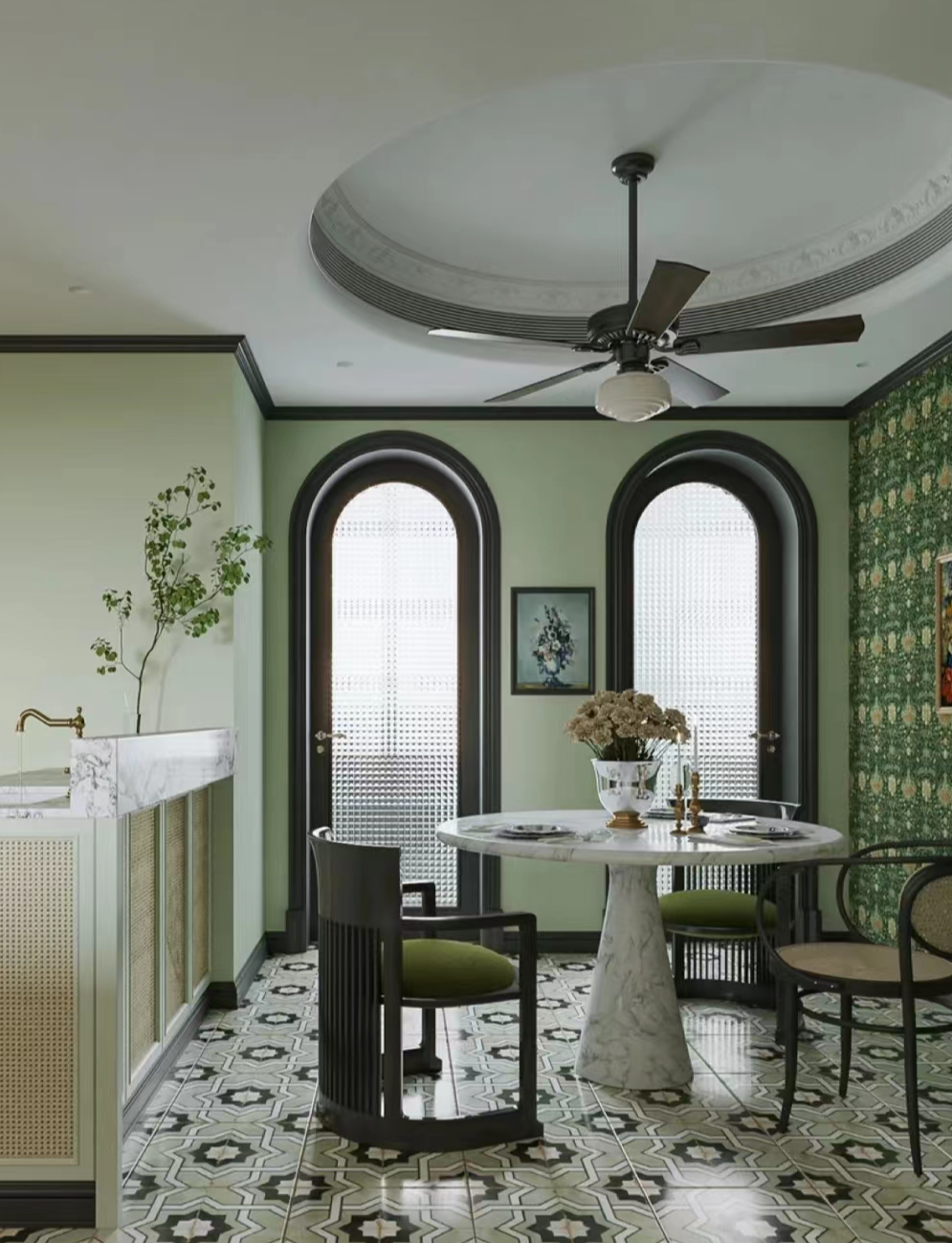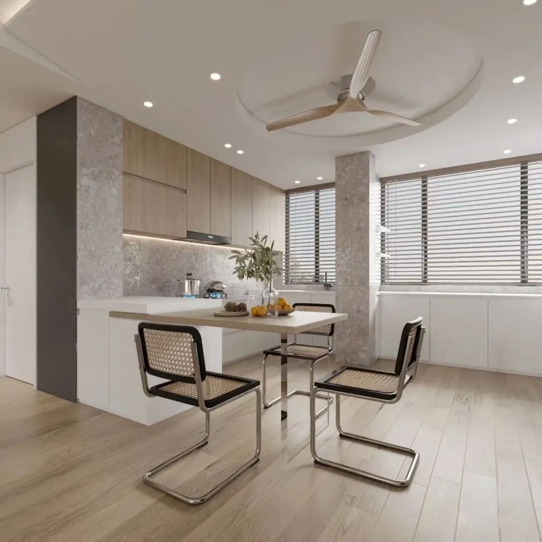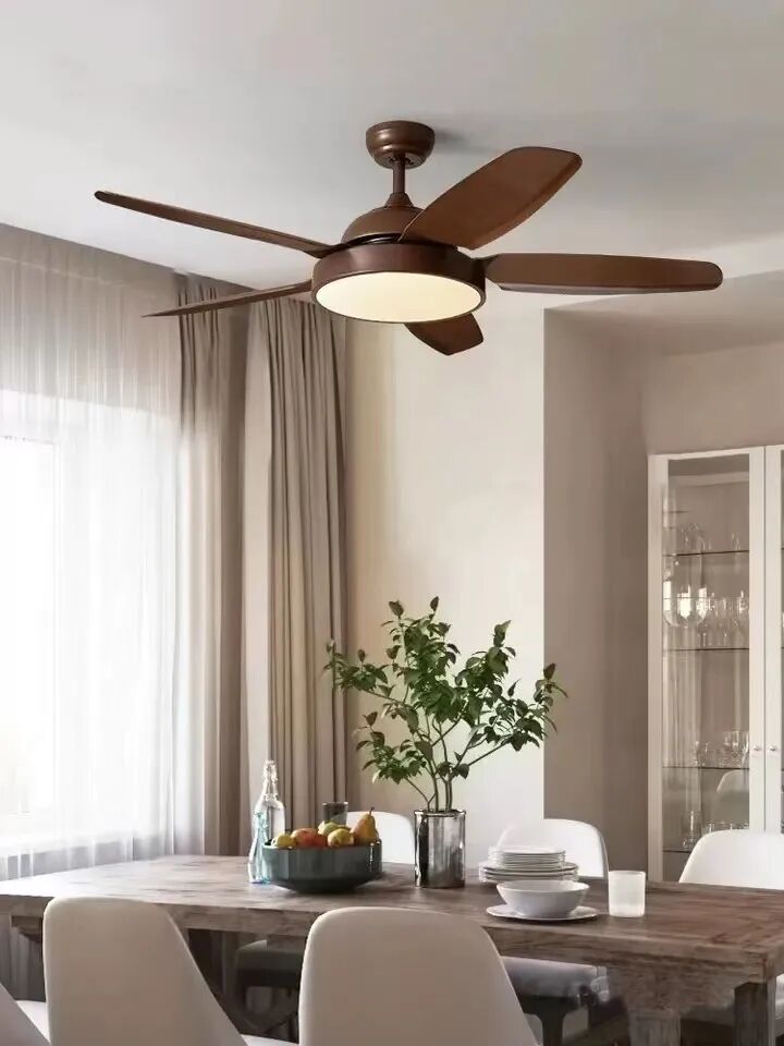 很多人会觉得,吊扇加灯的设计会显得比较拥挤,影响室内风格布局。其实恰恰相反,这种吊扇灯具有很好的装饰效果,用在各种风格中都不违和。吊扇灯扇叶的材质也很多选,金属、木质,不易变形,强度也很高,装在餐厅非常亮眼。