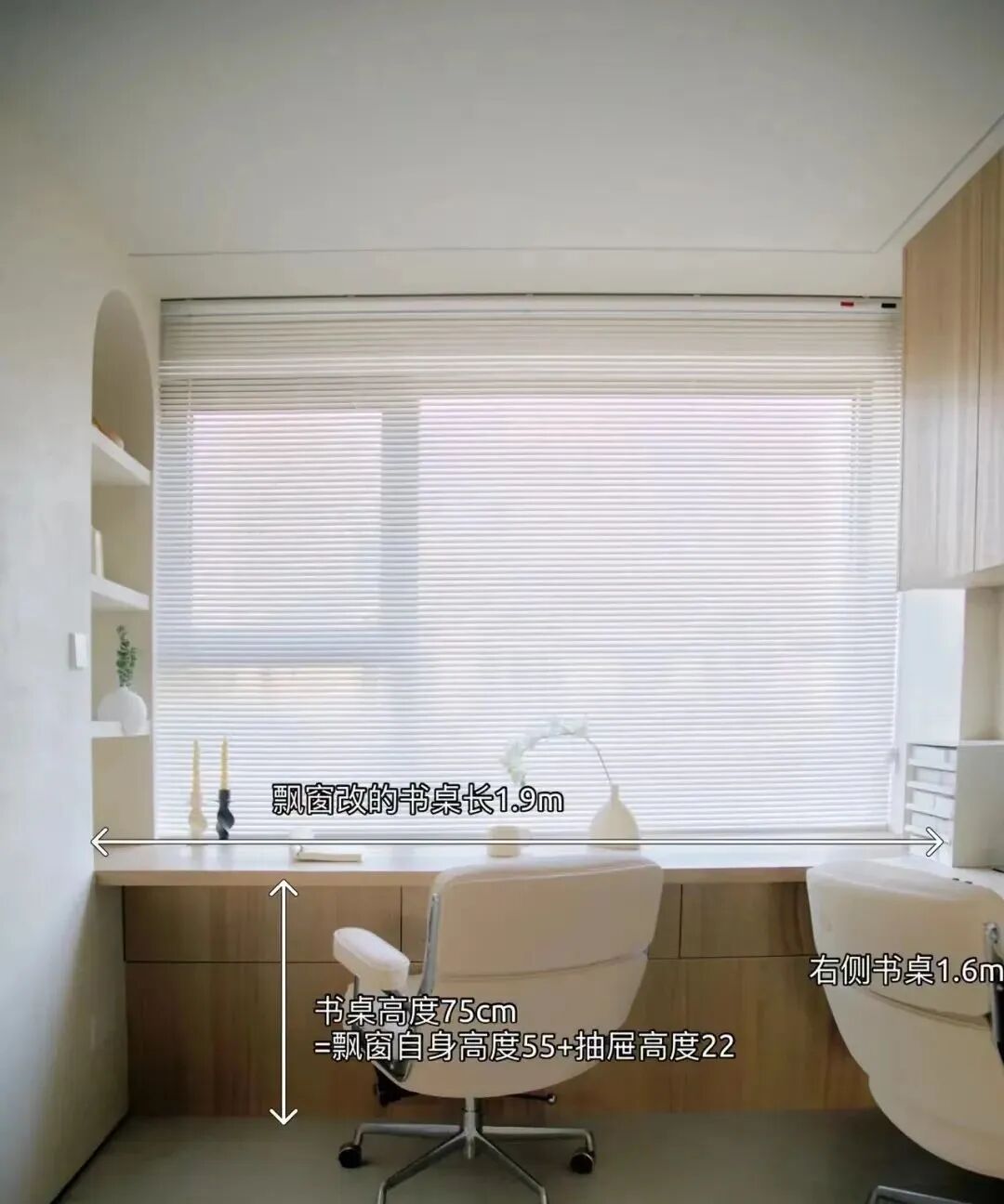 飘窗书桌记得台面深度超过飘窗至少25cm,这样可以留出放腿的空间。一般桌面距地面建议高度75cm,坐着会更舒适。