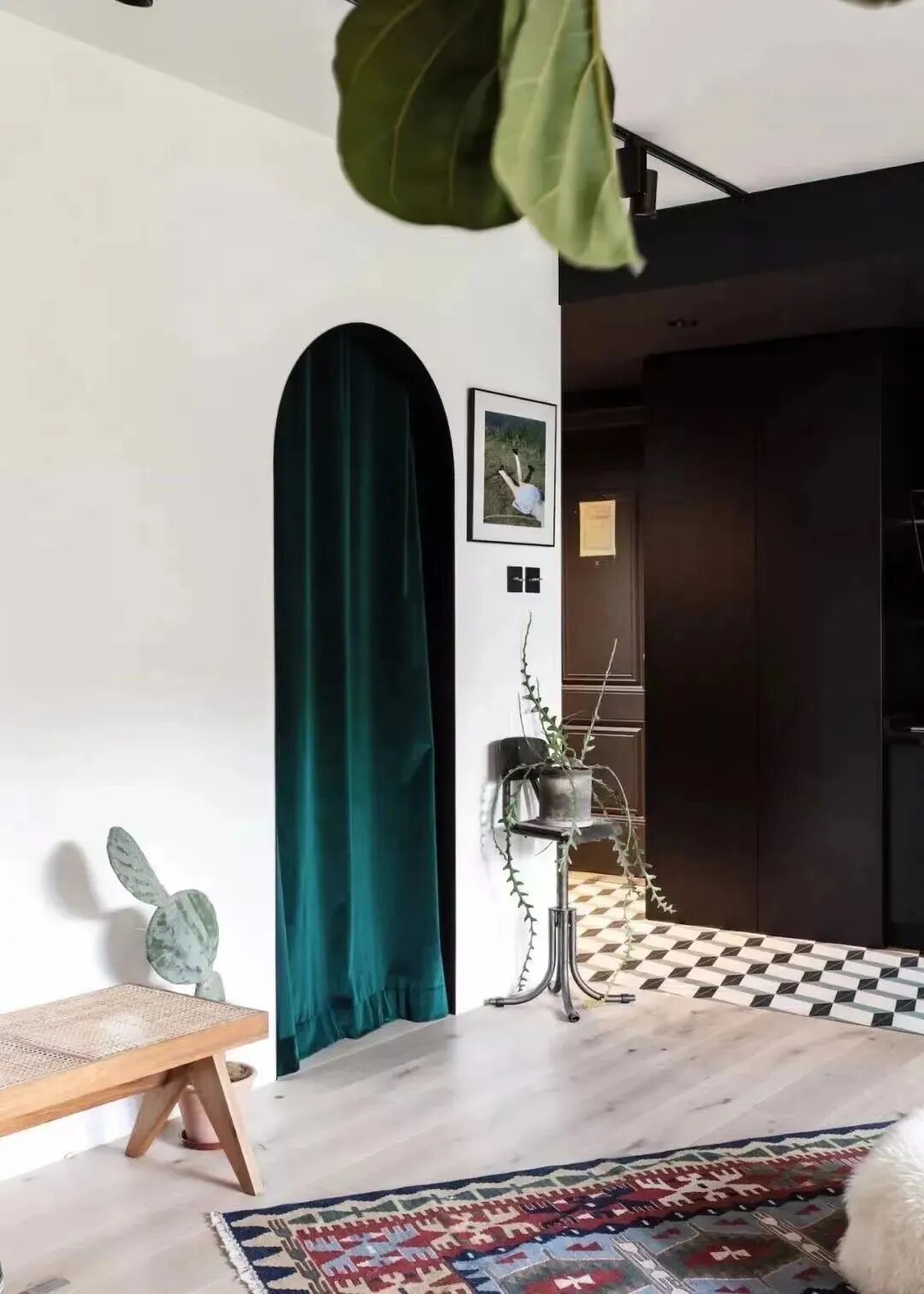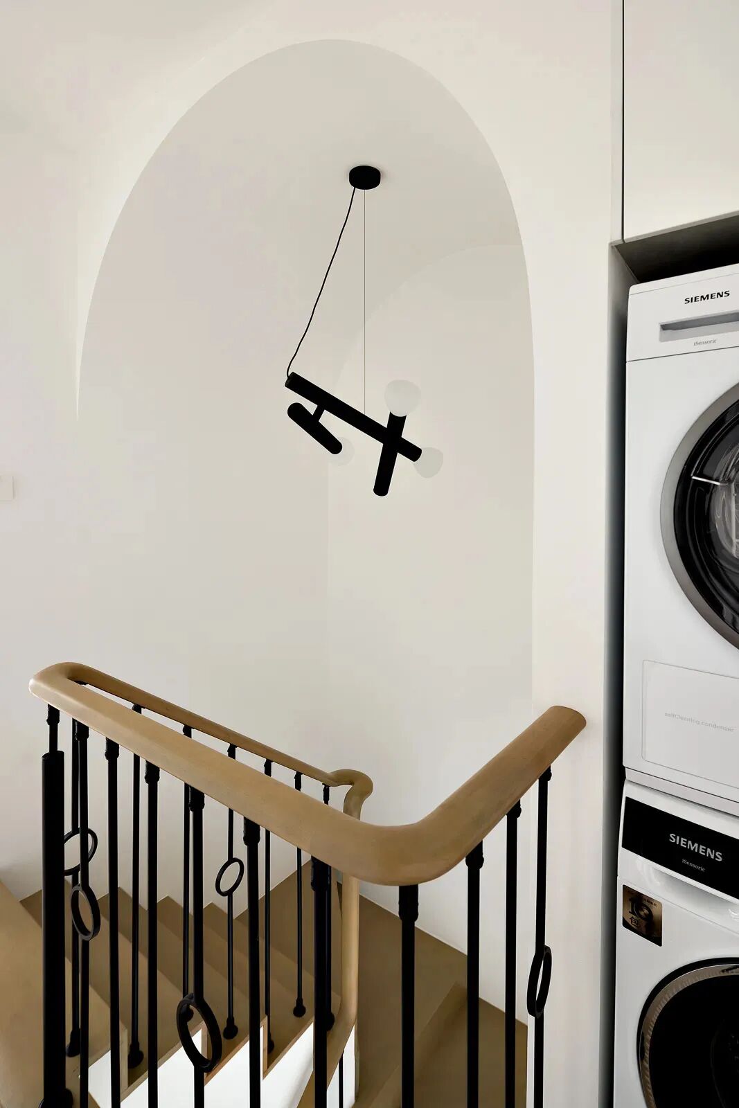 还可以设计一个高颜值还能拉高空间高度的拱形门,增加白墙的艺术美感。楼梯上方的拱形吊顶,安装黑色线条感吊灯,给白色墙面拉出延伸感。