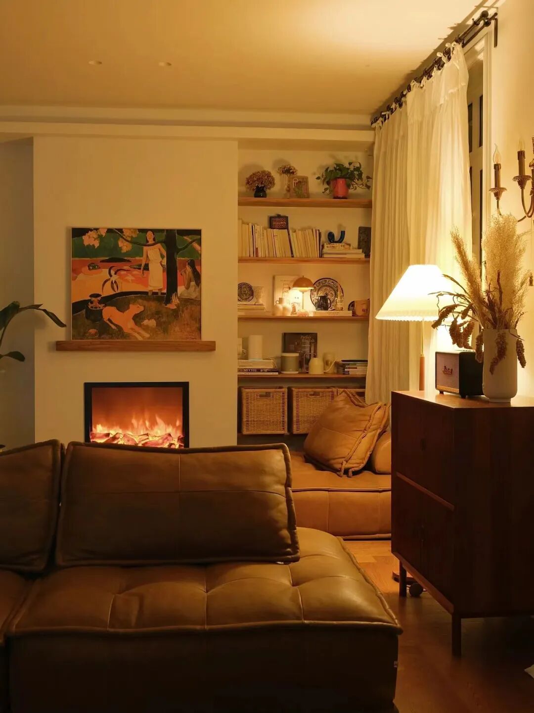 在平平无奇的大白墙上加上灯光,故事感、氛围感立刻就有了!无主灯设计让白墙瞬间有了明暗和光影,有了层次感。白墙+壁炉,是其他颜色墙面都没办法带来的原始温暖感。