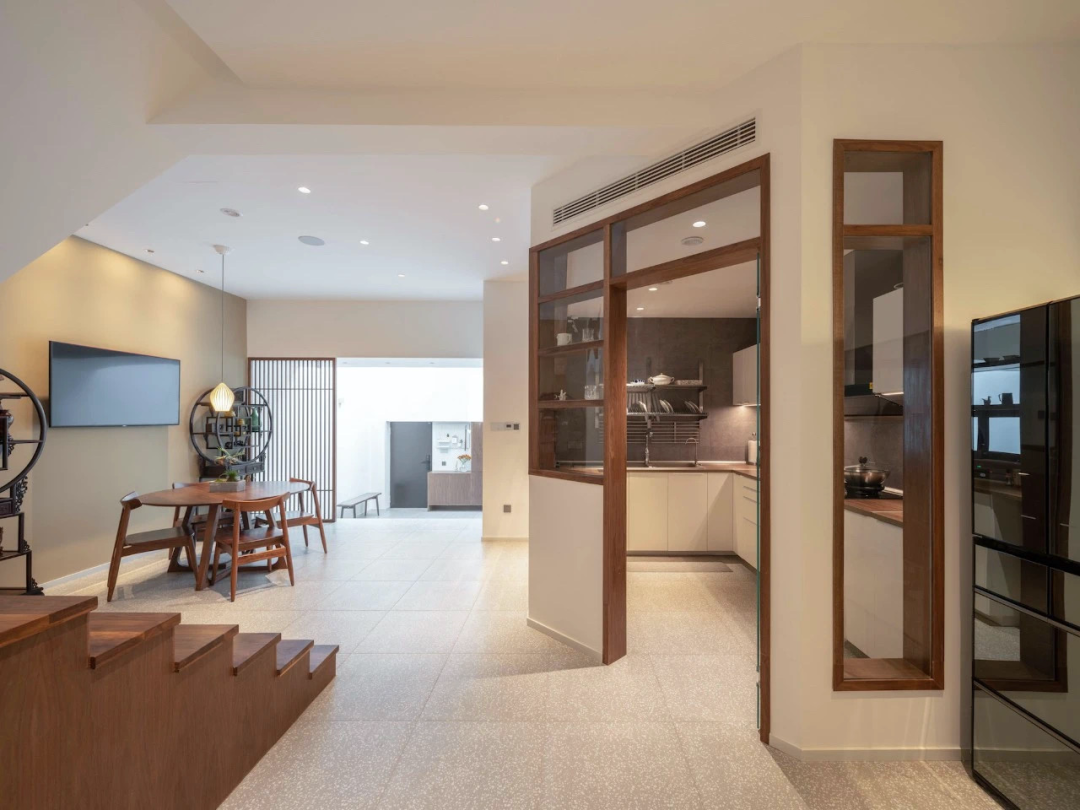 实木隔板的线条隔断,白墙如宣纸一般,与胡桃木餐桌很好地衬托了中式的典雅。