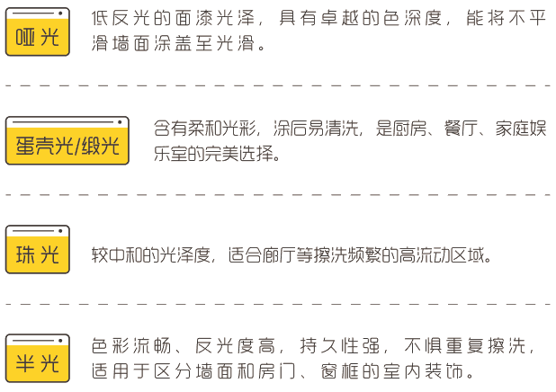 国内涂料一般都以低调的哑光面为主,而在国外,“光泽度”的变化更加丰富,是选涂料时的一个重要参考因素。最常见光泽度有如:哑光/平光、蛋壳光、缎光、珠光/半光,光泽度呈递增的状态。
