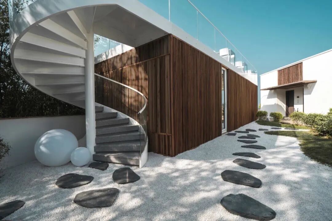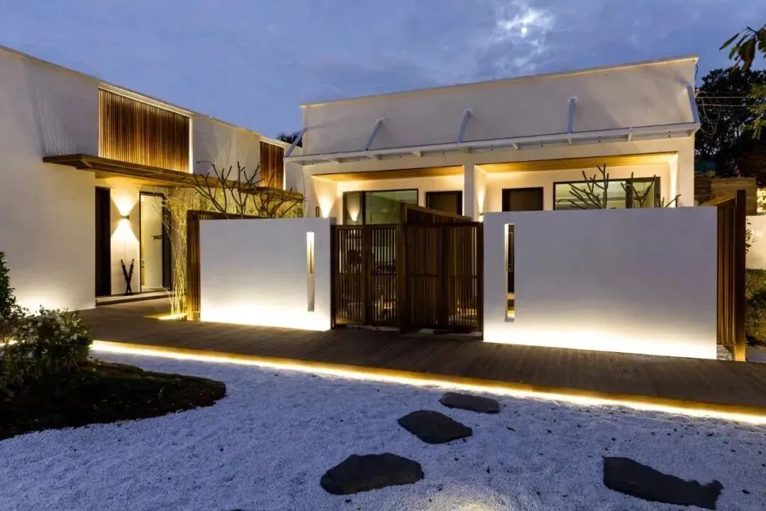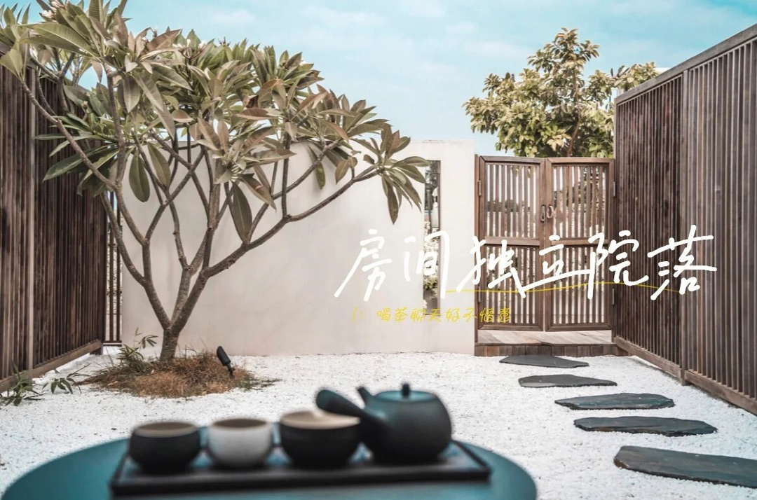 白色为主的建筑设计,也结合了日式极简风设计,因为木材、石子和绿植也变得十分朴素、禅境,公共区有三角梅花海,也是一大特色。
