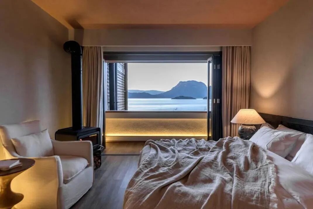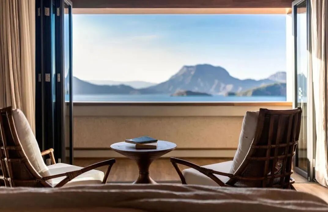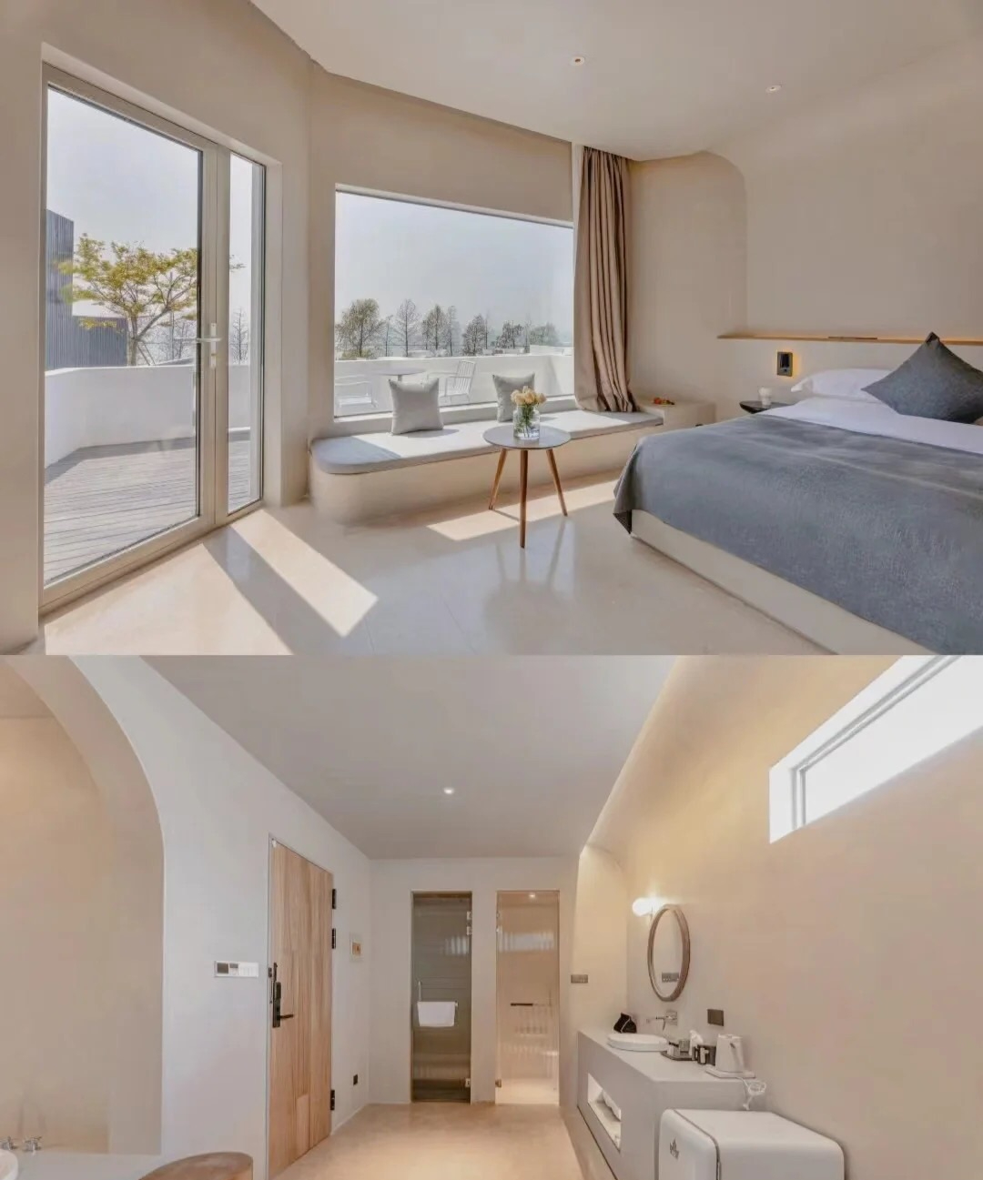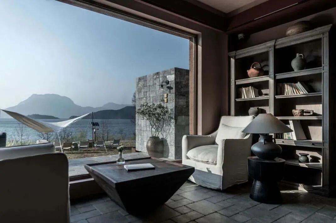 湖景泳池的氛围感,白色ins风的户外餐椅,一共14间湖景客房,从公共空间到房间都能看到湖景,十分浪漫,依水建庐,直面万顷湖色,立刻让喧嚣的心灵就平静下来,看最美的日出日落。