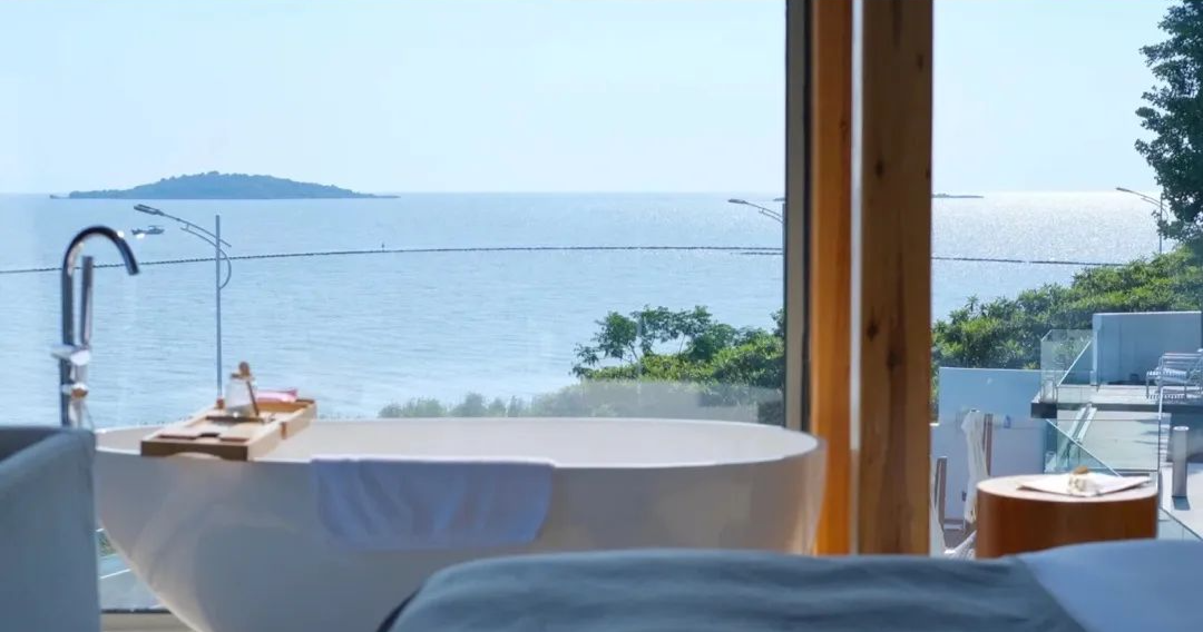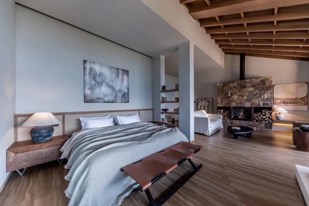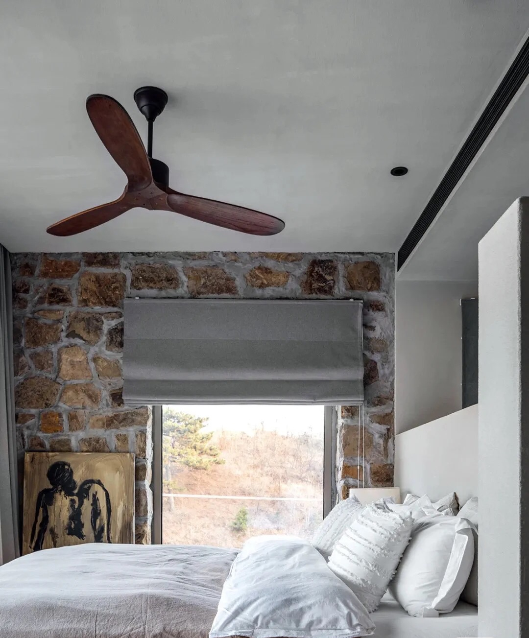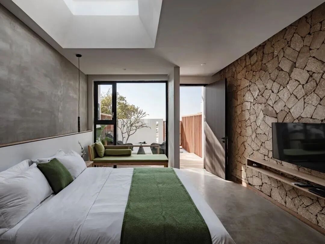 整个房子的设计既现代又乡村,所有家具都是设计师定制款,软装又有棉麻、粗陶、黑铁的厚重质朴,坐在藤椅上感受时光被凝固了,如果累了就躺在房间里,窗景很治愈,像陷进山海间,度假简直堪比梦境。