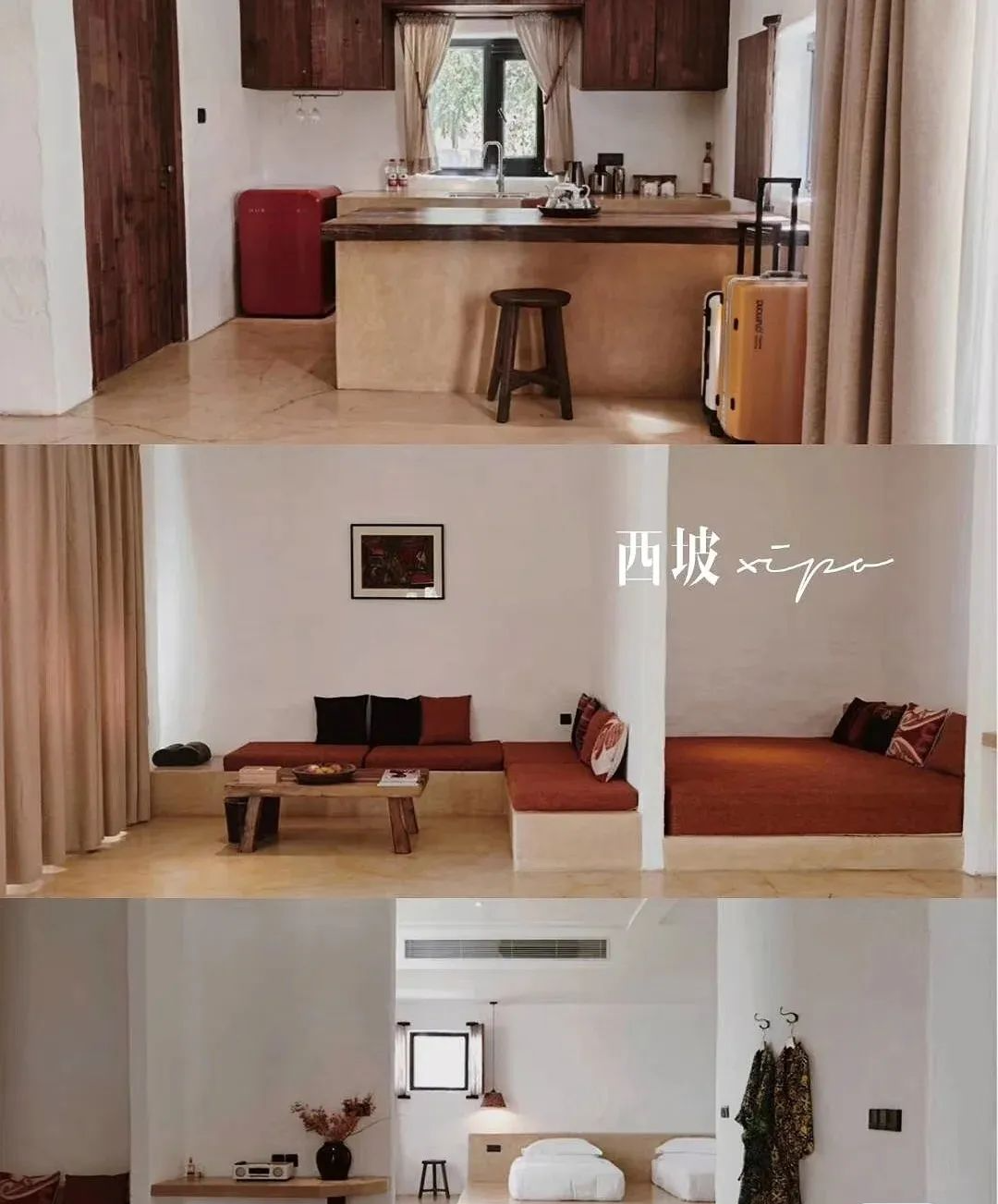 西坡:和当地的黄土融合的很好,这家民宿保留了土坯房的传统院落,温暖的陶土色、粗粝的水磨石、矮墙,有种赤贫风,果院也是最独特的地方。这个季节去刚好合适,虽然早晚温差较大,但是却可以看到秋季最美的景色~