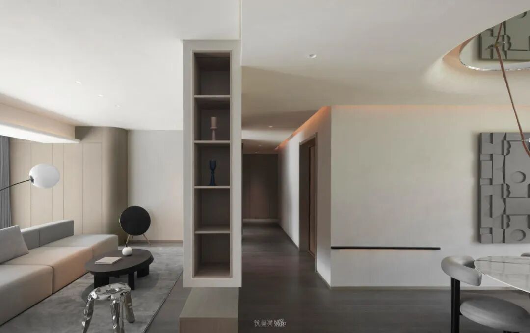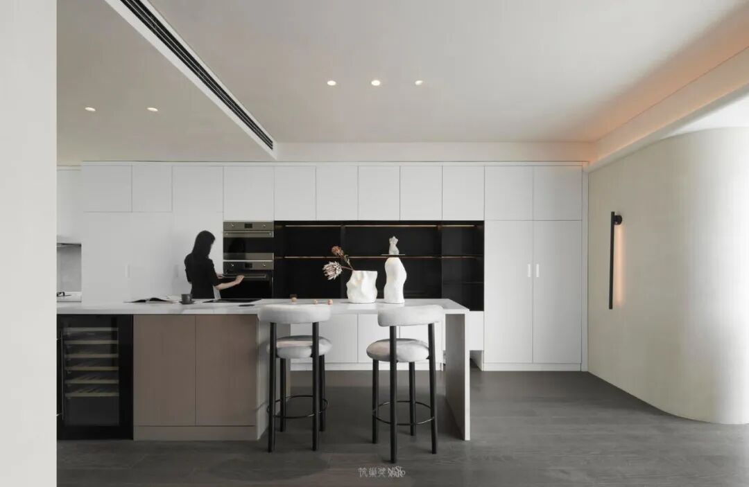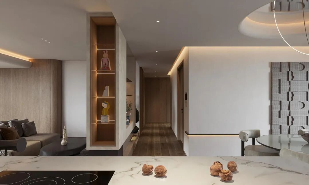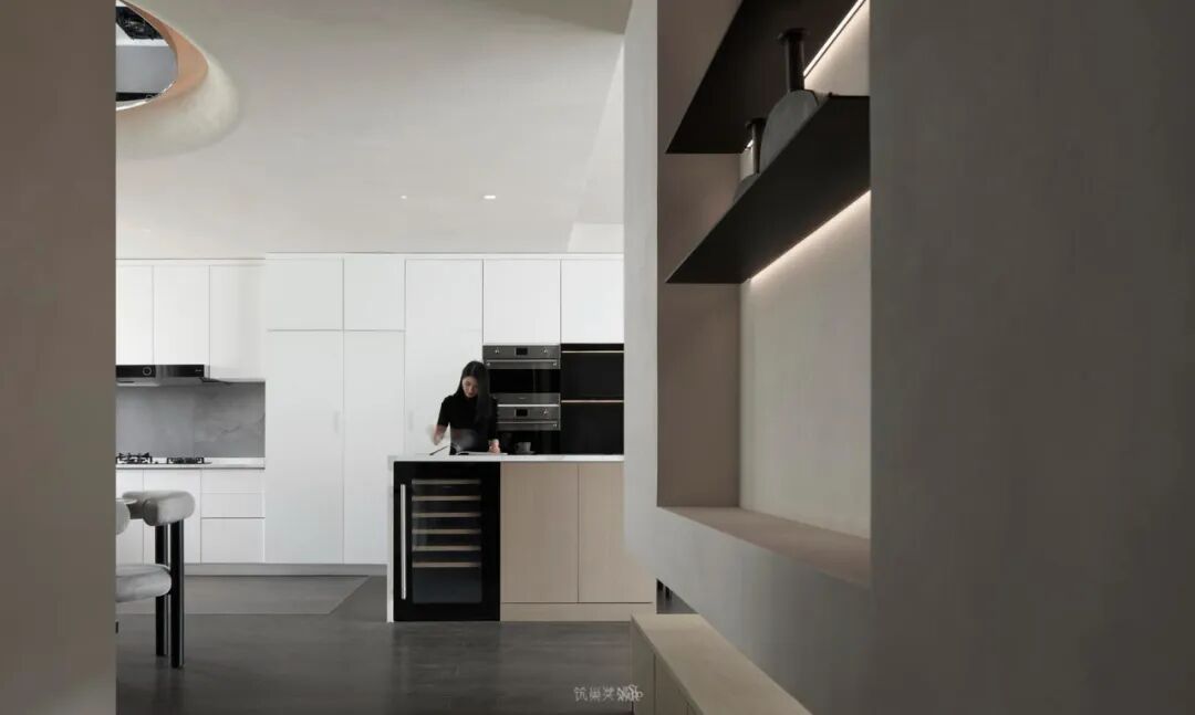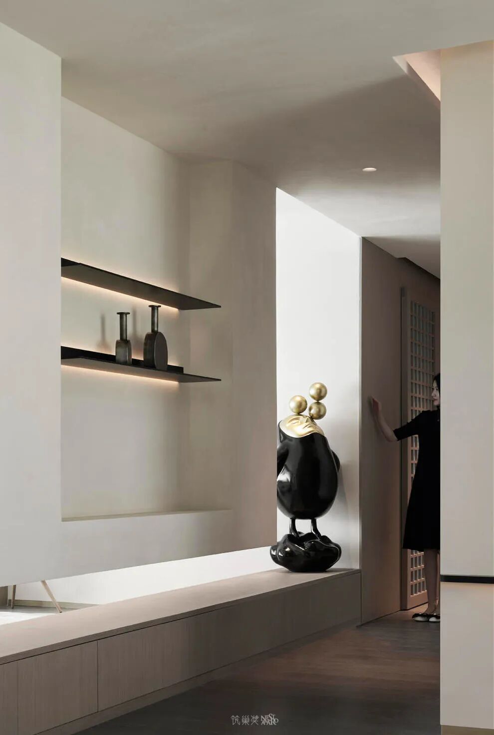 入户玄关悬挂处理,放置物品。一端为西厨操作台,可观看整个空间,玄关半透既不遮挡视觉也放置雕塑增加趣味性。