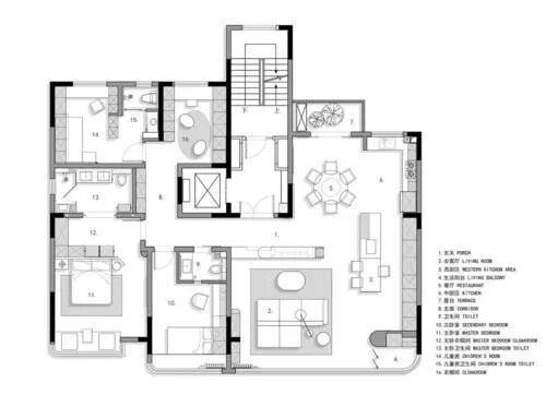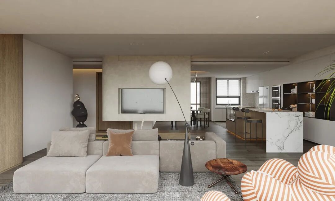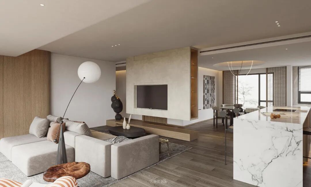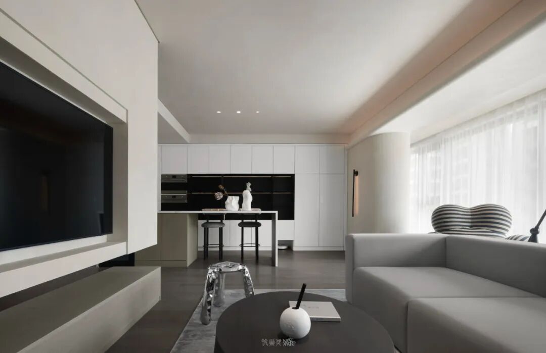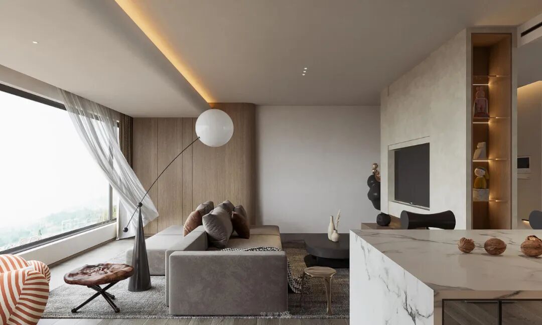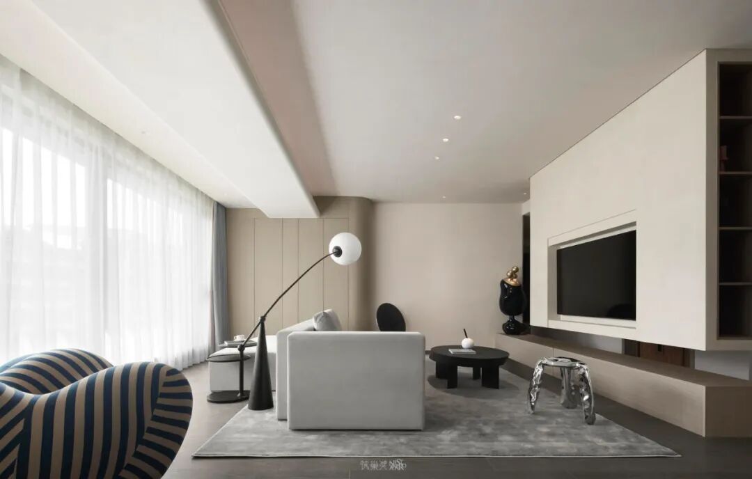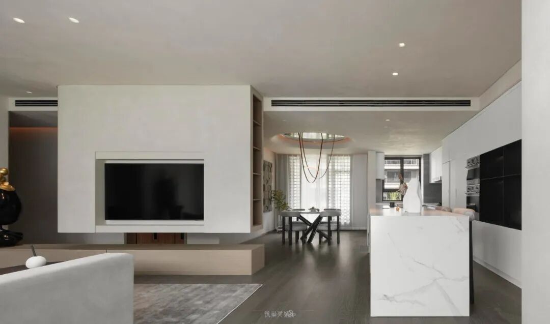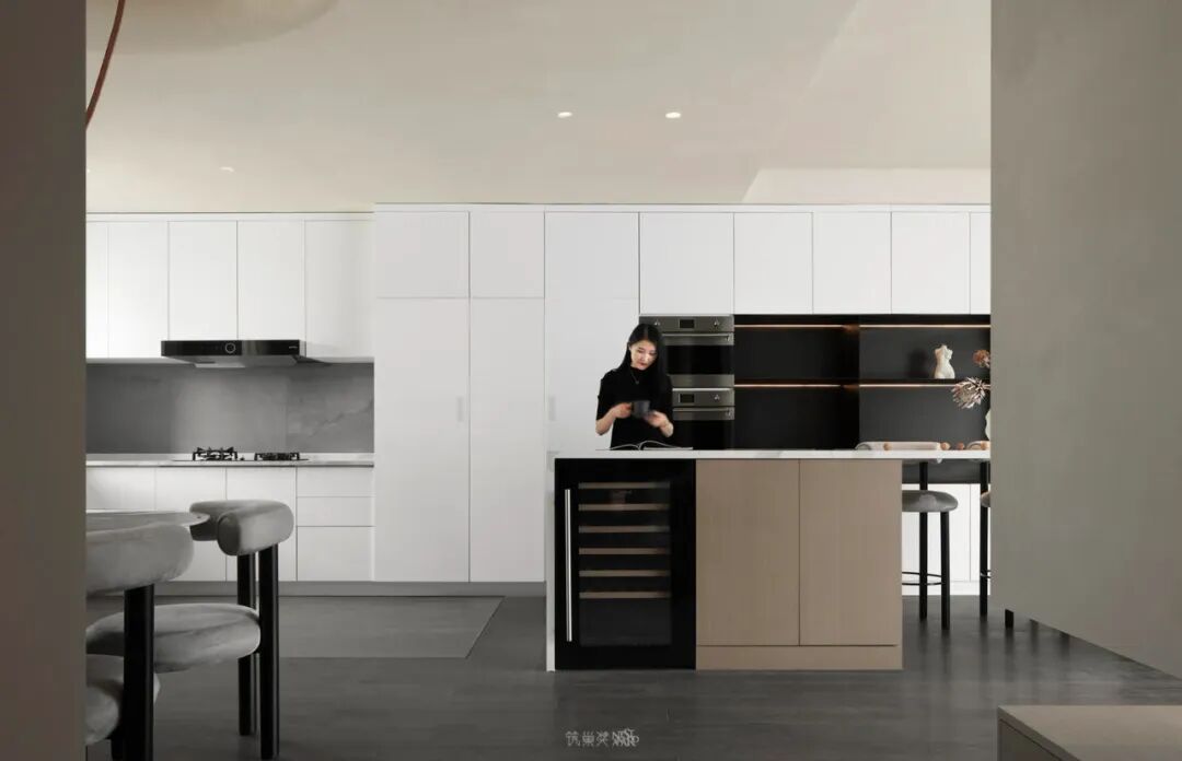 设计师综合了三口之家的日常使用需求,将整个空间打破重组,增加休闲会客的水吧空间,将客厅的方位调整,让山景进入室内。用纯粹而克制的表达手法和大面积的留白,铺设恬静淡雅,细部着以精雕琢磨,精致共鸣雅趣。