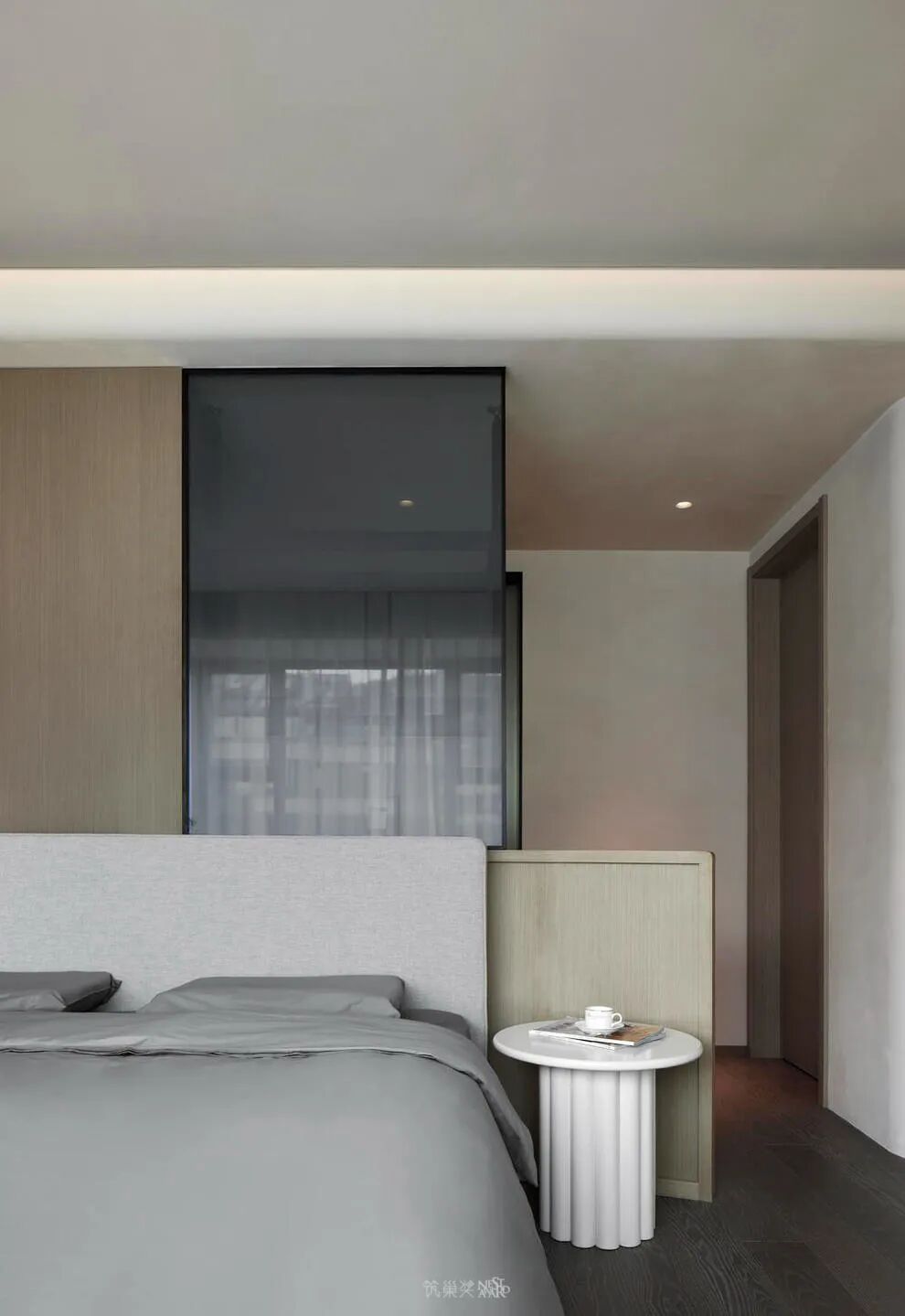卧室延续了公共区域极简大方的设计风格,大块面的木饰面搭配深灰色床品,时尚优雅。床头方向可观看山景,增加空间视野感。