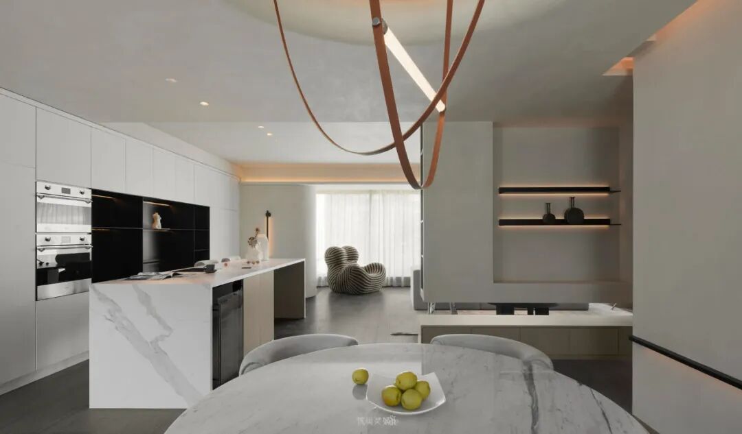 餐厅简洁地摆了一张大理石圆桌,可以容纳全家人聚餐,更符合中国人传统中团团圆圆的生活理念。