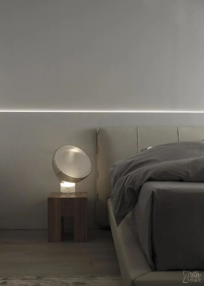主卧床头没有采用传统的背景墙表现手法,取而代之的是肌理艺术涂料,使棚面与墙面结合成有机的一体。内嵌线性光源,实现卧室用光的同时,自然分割了床头背景的立面墙,使大面积的墙体活泼灵动。