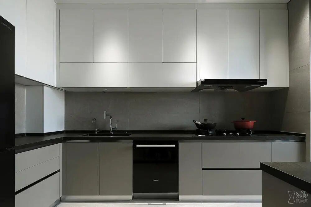 封闭式中厨,最大限度的利用立面空间用于收纳,同时保留完整的台面设计,便于烹饪操作。