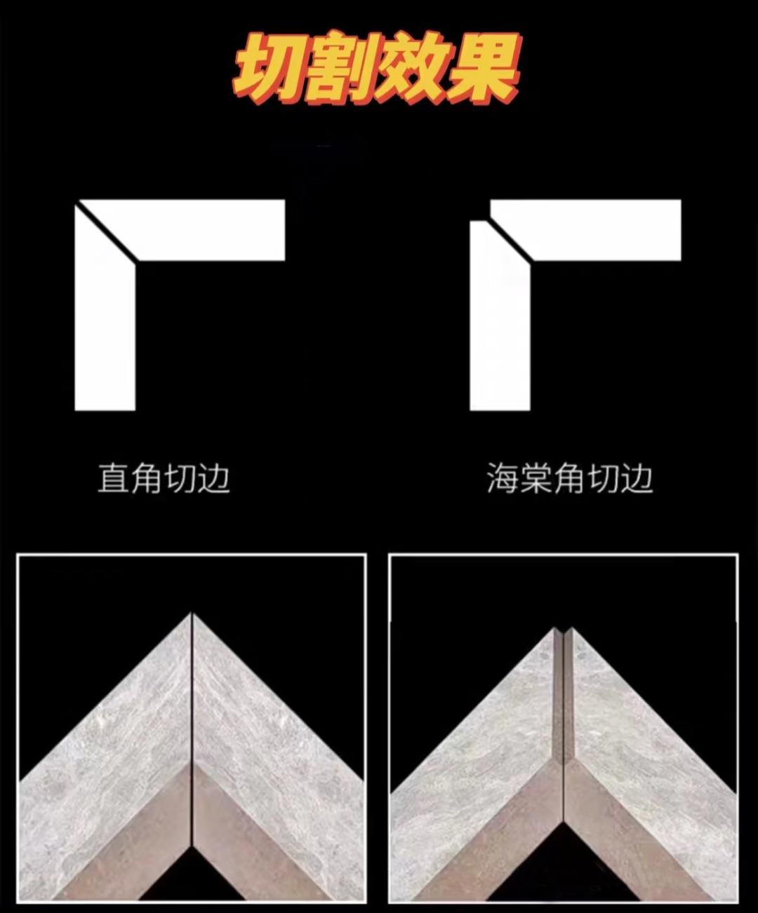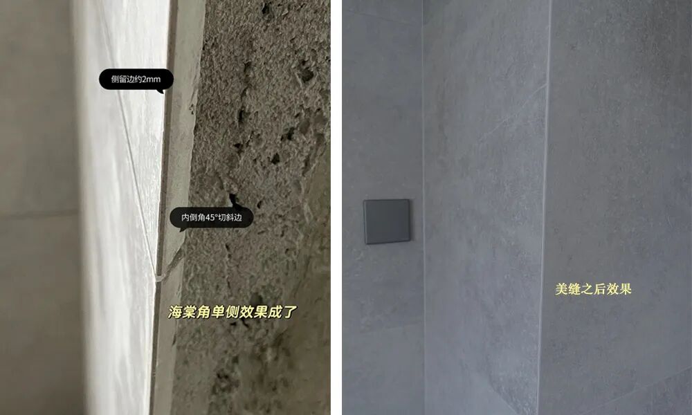 做成海棠角或者内倒角45度,再预留2mm平边,这样两块瓷砖90度相接的地方就不容易崩瓷,后期通过美缝,完美解决了硬收口,整体感强。