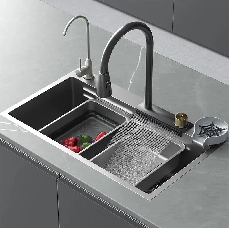为了省水,我妈干脆换上了现在爆火的飞雨水槽,水就像瀑布一样,出水均匀,也不会溅水,直接冲洗更快,水果和蔬菜的泥沙更容易冲掉,水储物在盆里。