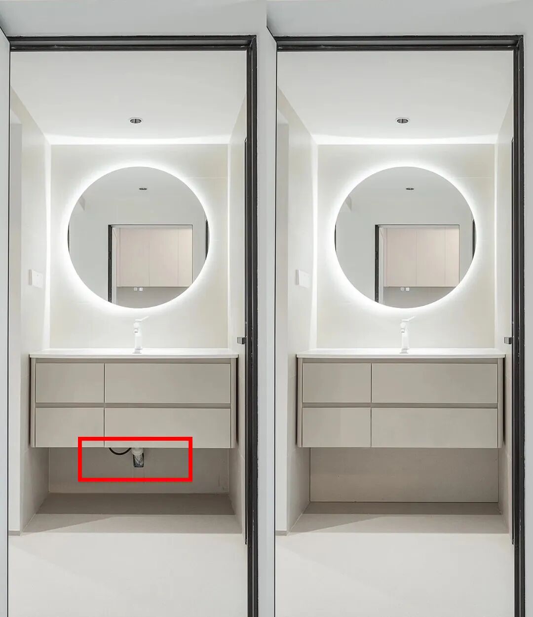 如果打算浴室柜做悬空设计,一定要做成墙排,既美观,而且空间能真正利用起来,抹布扫一圈就干净了,墙排建议做成45度出墙,比90度下水更顺畅,还要预留检修口,方便后期维护。