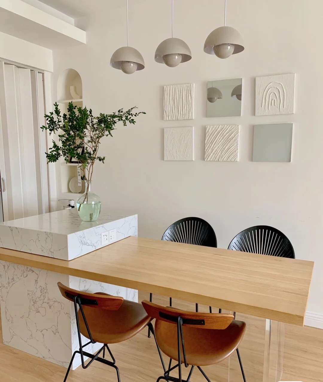 餐厅直接做成岛台一体式餐区,岛台代替餐桌,只需配上你喜欢的几把餐椅就能满足日常使用,而且整体的设计感更高,也方便打理。
