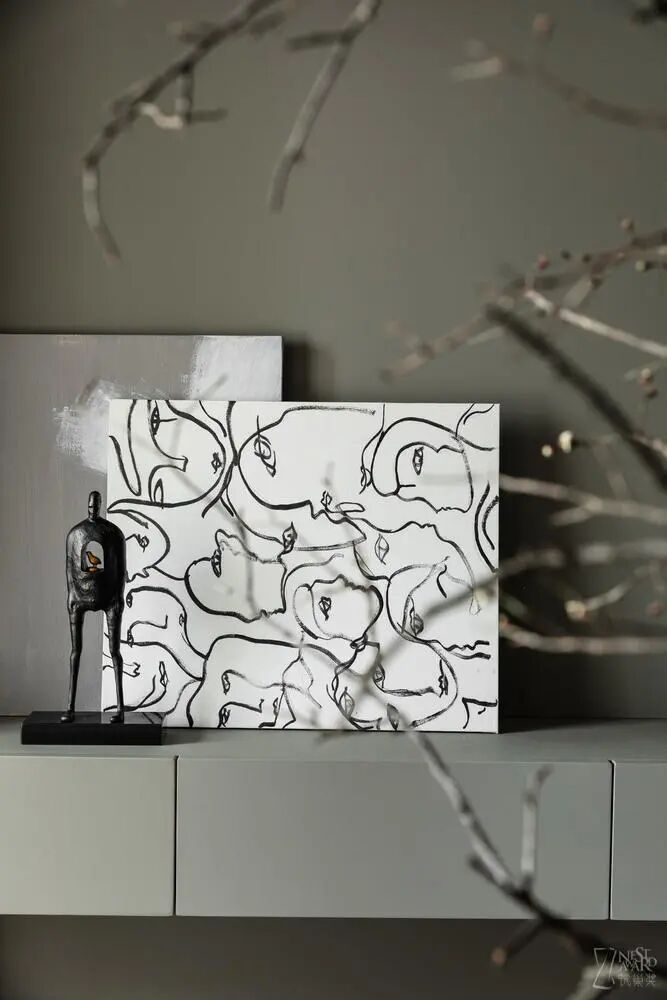 悬空电视柜与深灰色软装配饰完美融合,高级又精致。颇具艺术感的桌面摆件和小幅画作,提升着整个空间的格调。
