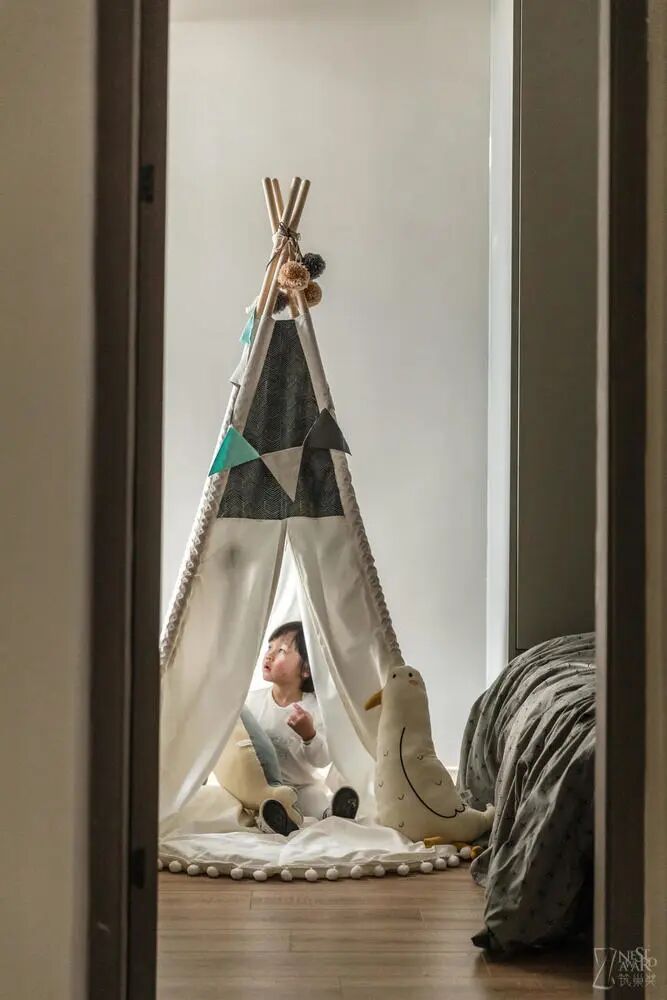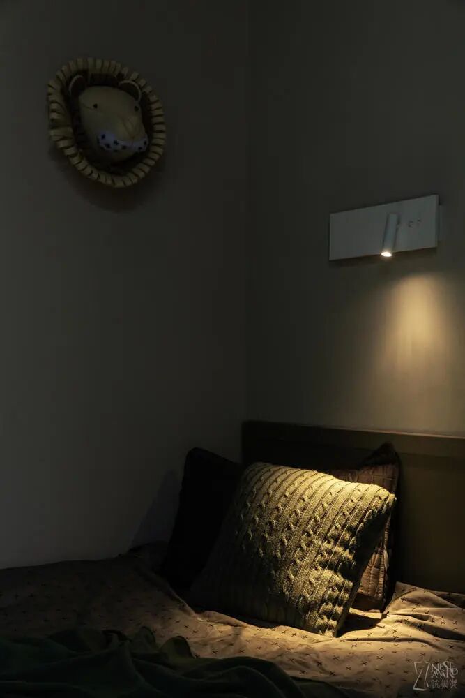 儿童房是一个一字型布局,是一个兼顾睡眠、收纳、娱乐的小空间,在配色上使用的是与大空间相符合的牛油果绿与驼色,同时增加了一些儿童元素,小动物的抱枕、挂件和同色系的帐篷,以此提升空间的趣味性。