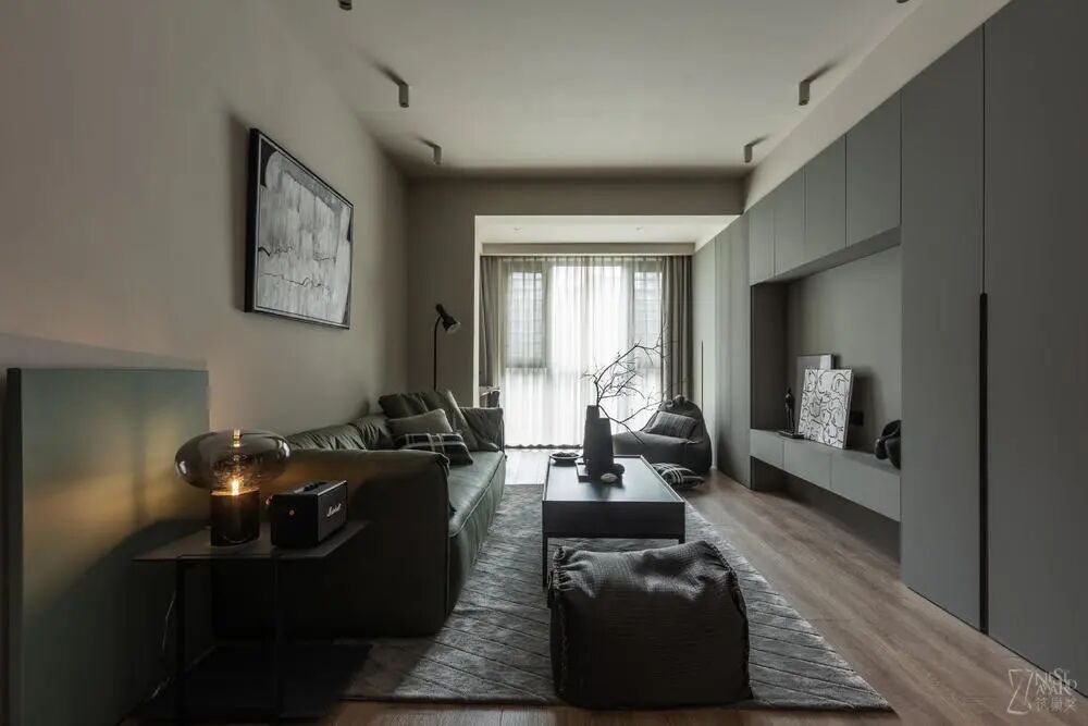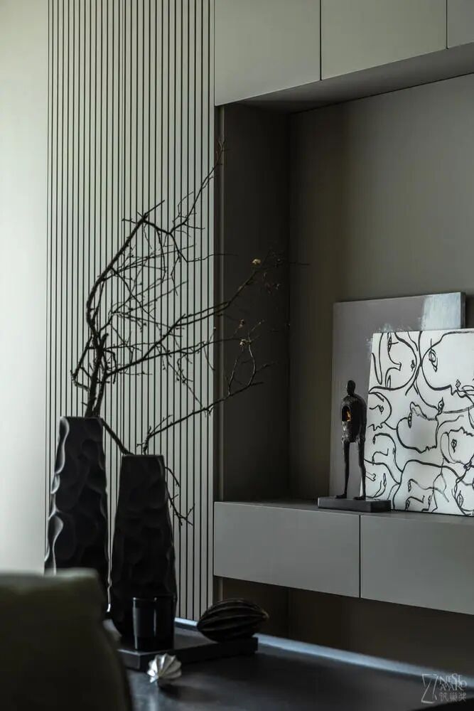 客厅用大块面的黑白灰打造出极简轻奢的质感,去掉繁杂的装饰,化繁为简,以不同的分隔方式和收口方式,来突出极简家具的细节美感。