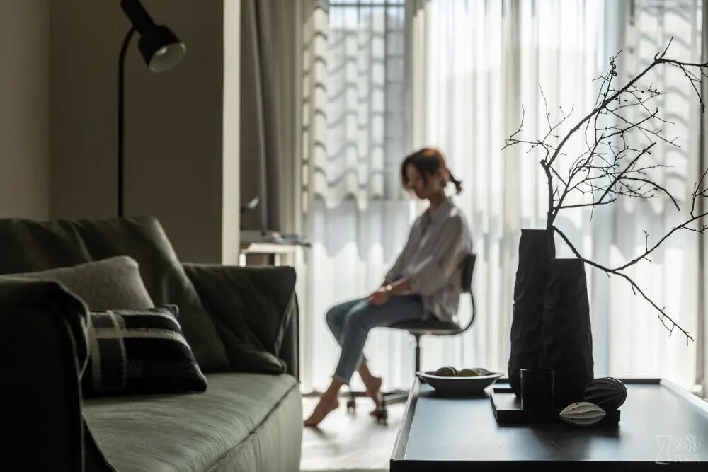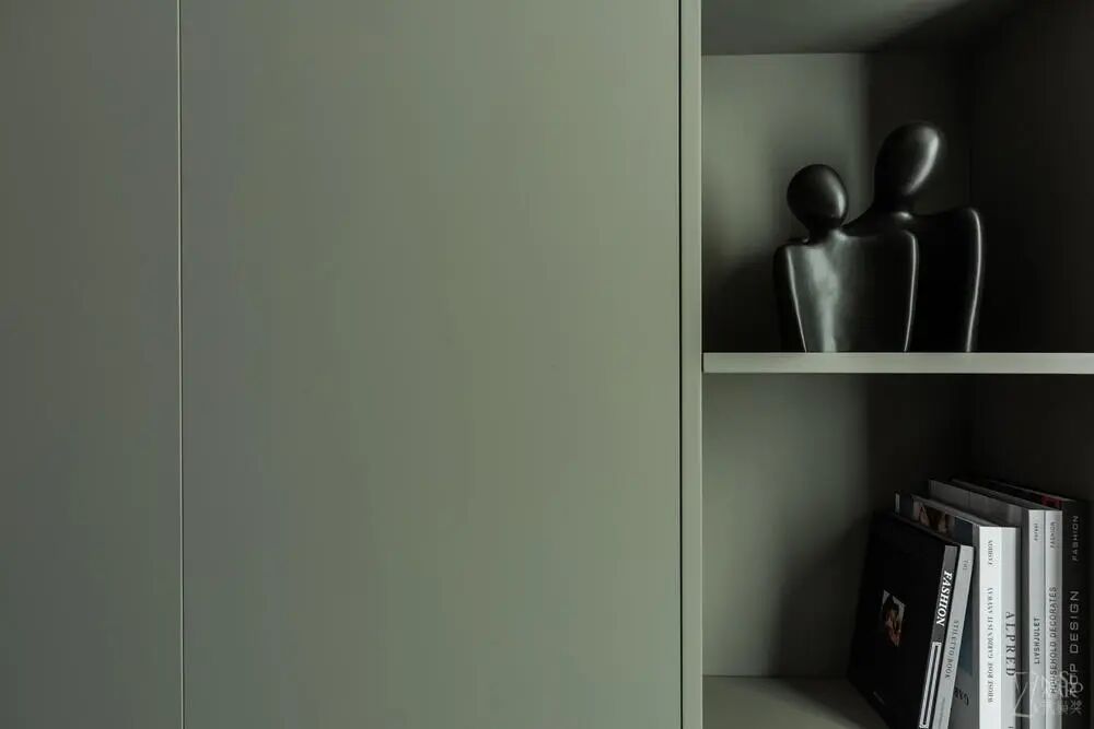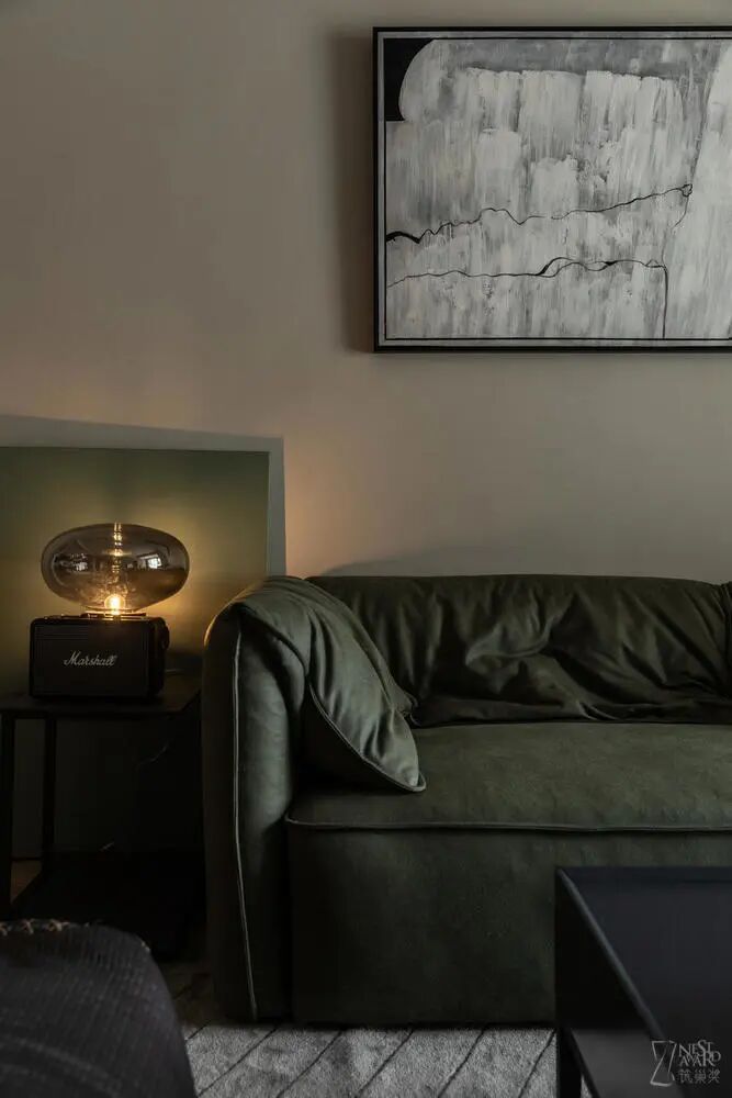 在颜色上设计师选择了牛油果绿并进行了调整,加入一点灰调,让空间更呈现出平静又比较自然的质感。墨绿色沙发搭配黑白质感的油画,冷静而克制。灯具上则选择无主灯设计,灯光在满足照明需求的同时,更能营造空间氛围。