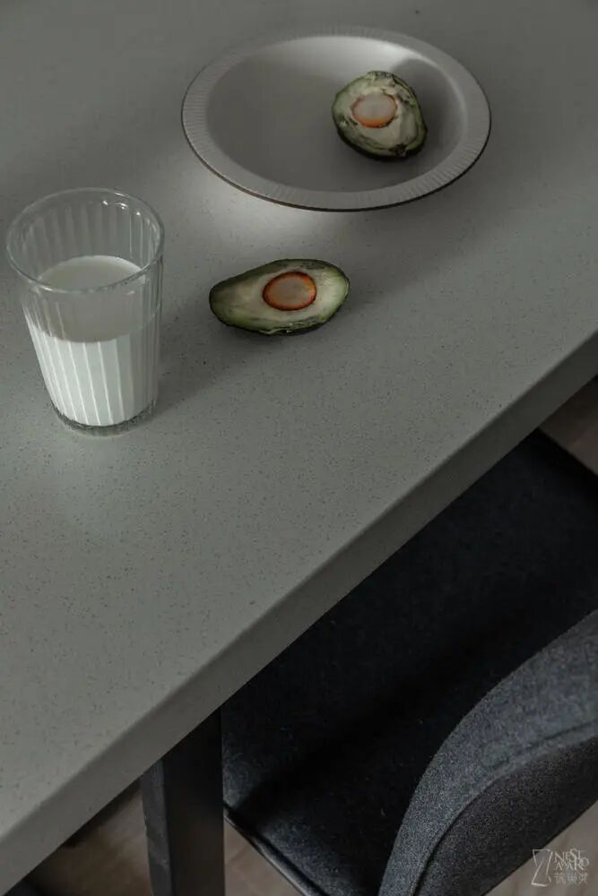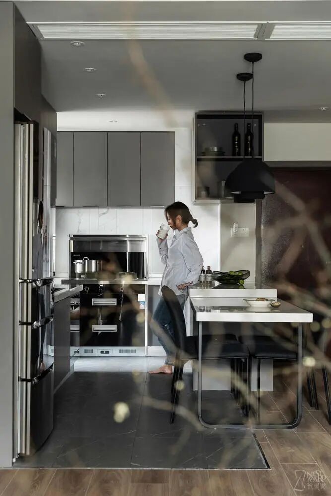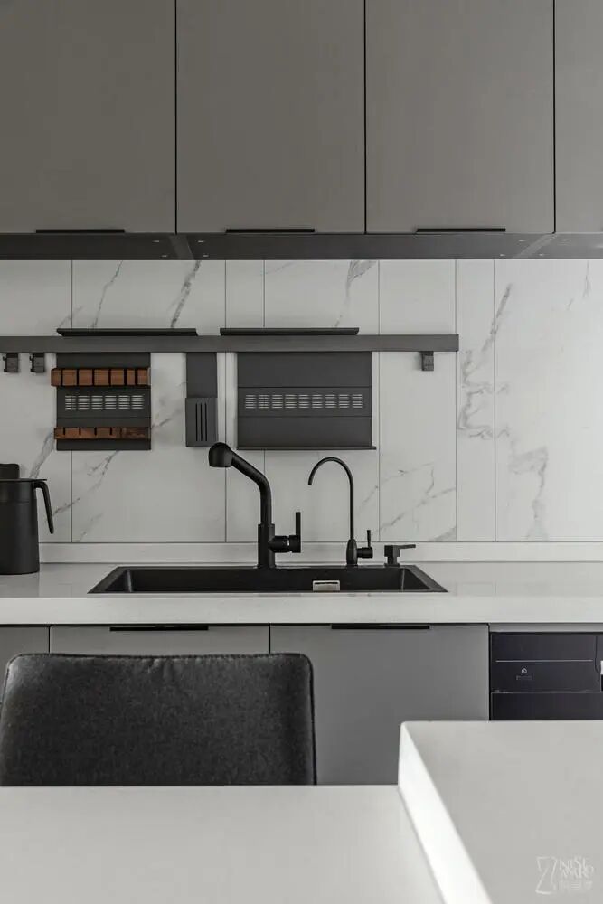 厨房使用同色系把手置、物架让整个空间更加整体、干净,在细节之处体现极简的做法,从而成为整个空间的带给人的感受。