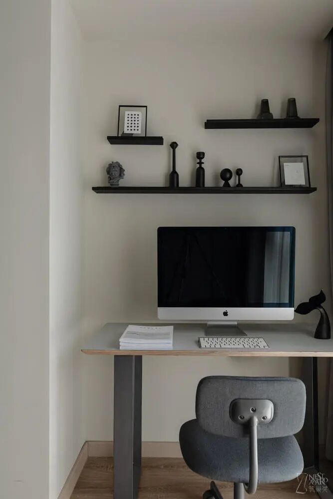 在原本休闲阳台的位置规划了书房的使用区域,将公共空间的利用最大化。墙面用置物板巧妙装饰,也不显单调。闲暇的午后在这里捧一本书,尽情享受阳光的沐浴和温暖。