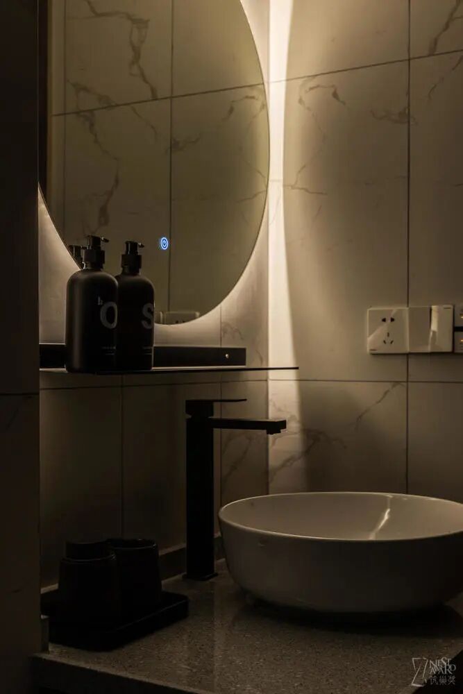 原始户型的每一个预留空间都不是很足够,储物空间也预留不足,视觉空间偏狭小。设计师摈弃了过分艳丽的色彩和装饰,用极简现代的手法打造出高级感,用材质、灯光、色彩等把控细节,用克制“限制”设计,却用细节将设计的想法发挥到极致。