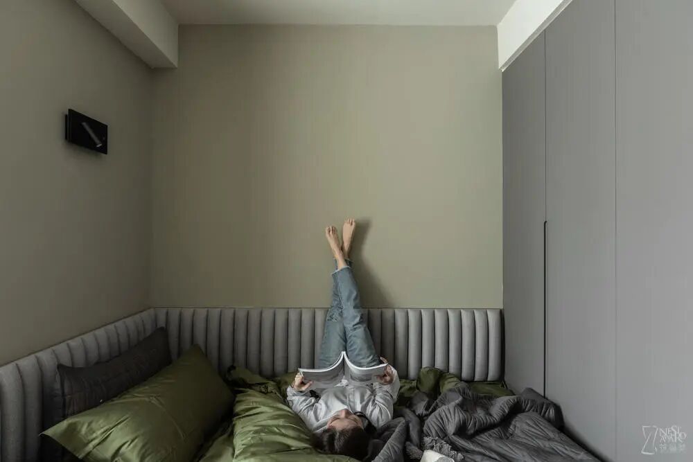主卧室床品与衣柜相连,睡眠功能与储物功能一体,节约空间,同时也保证了使用功能,床头软包墙防碰伤同时增加睡眠舒适度,温馨舒适。