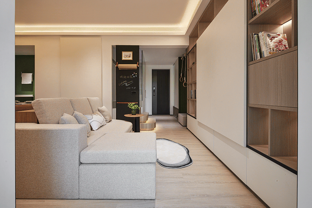 设计师余颢凌受邀参与这次改造,在全面考察了一家人的生活居住习惯及房子自身的情况后,从安全感、舒适性、成长性三个方面入手,在55㎡空间内解决了三代人的生活起居的问题,还为游游打造了一个专属的三层“游乐场”!