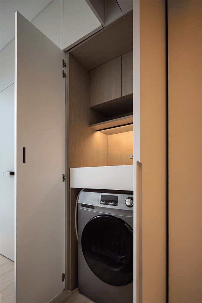 打开书桌后面的门板,里面是一台洗衣机,顶上也有一个隐藏的晾衣架。洗衣机边上还隐藏了一个小小的洗手间,这样就彻底解决了早上起来抢厕所的困扰。