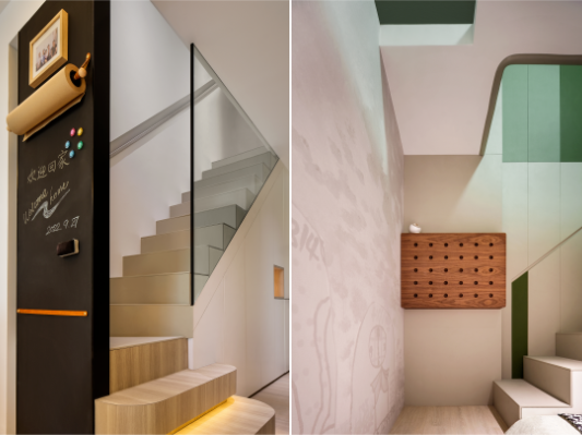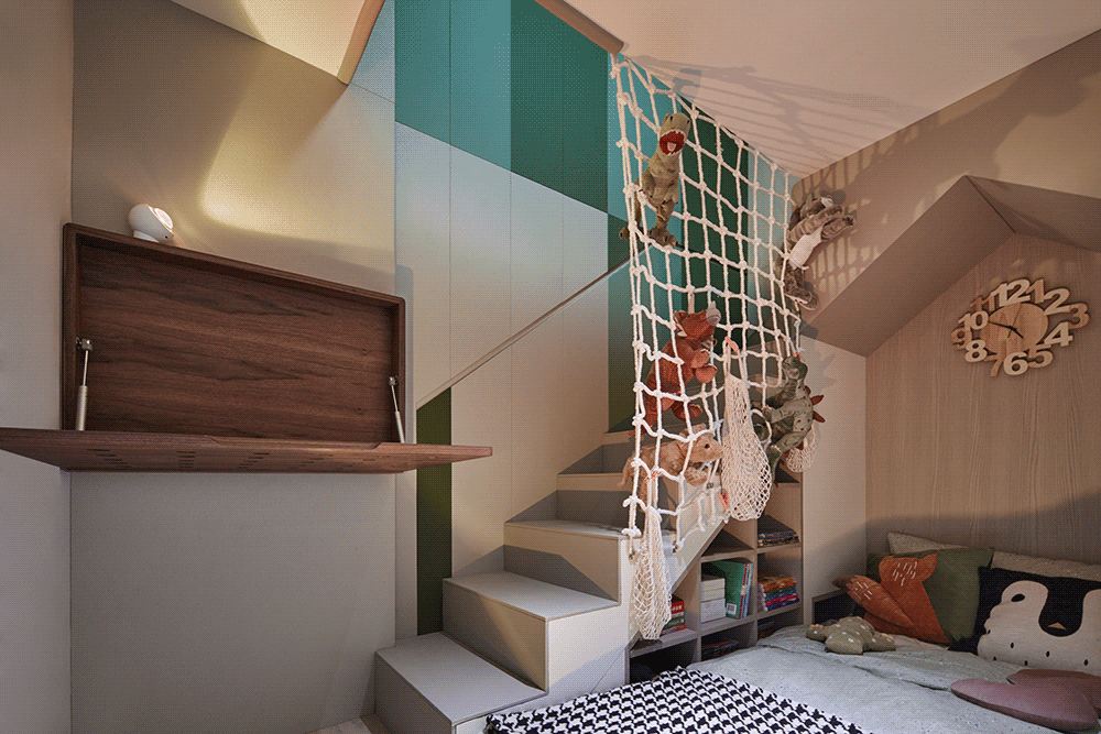 然而本次改造最大的亮点,还是游游那个由阁楼改造而来的“游乐场”。走上平缓的楼梯,来到二楼,这里是游游的专属卧室,再也不用睡爸妈中间了。