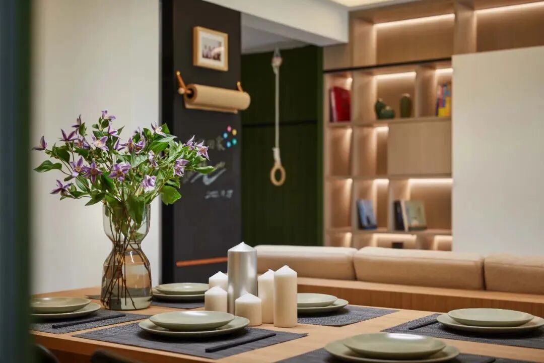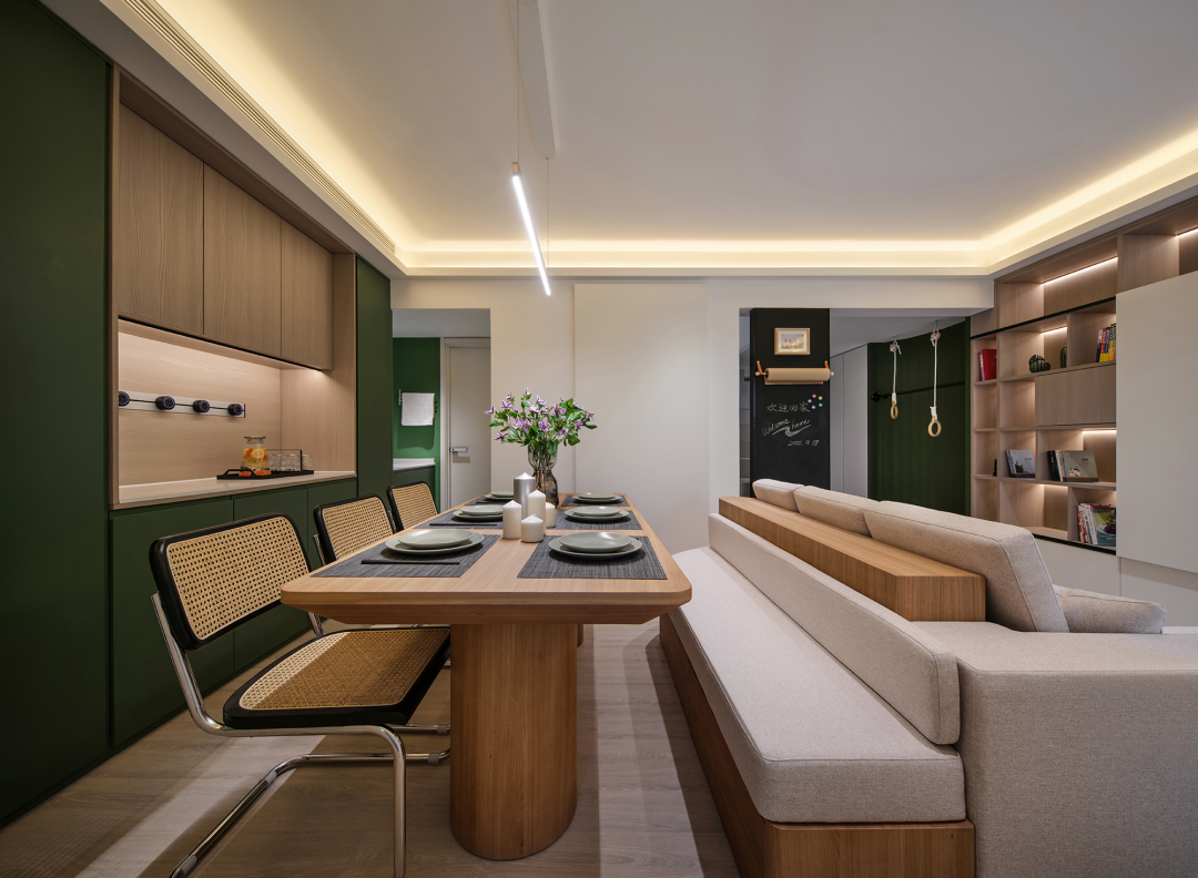 客餐厅区域设计成了一个通透宽敞的大横厅,涵盖了四大功能:水吧台、餐厅、沙发区、电视和书架区。地面采用了具有防潮功能的石晶地板白色、原木色和绿色的搭配让空间温暖宜人,又充满希望。