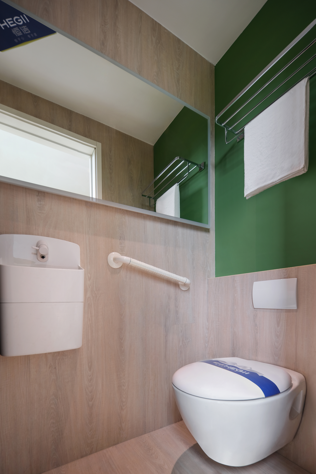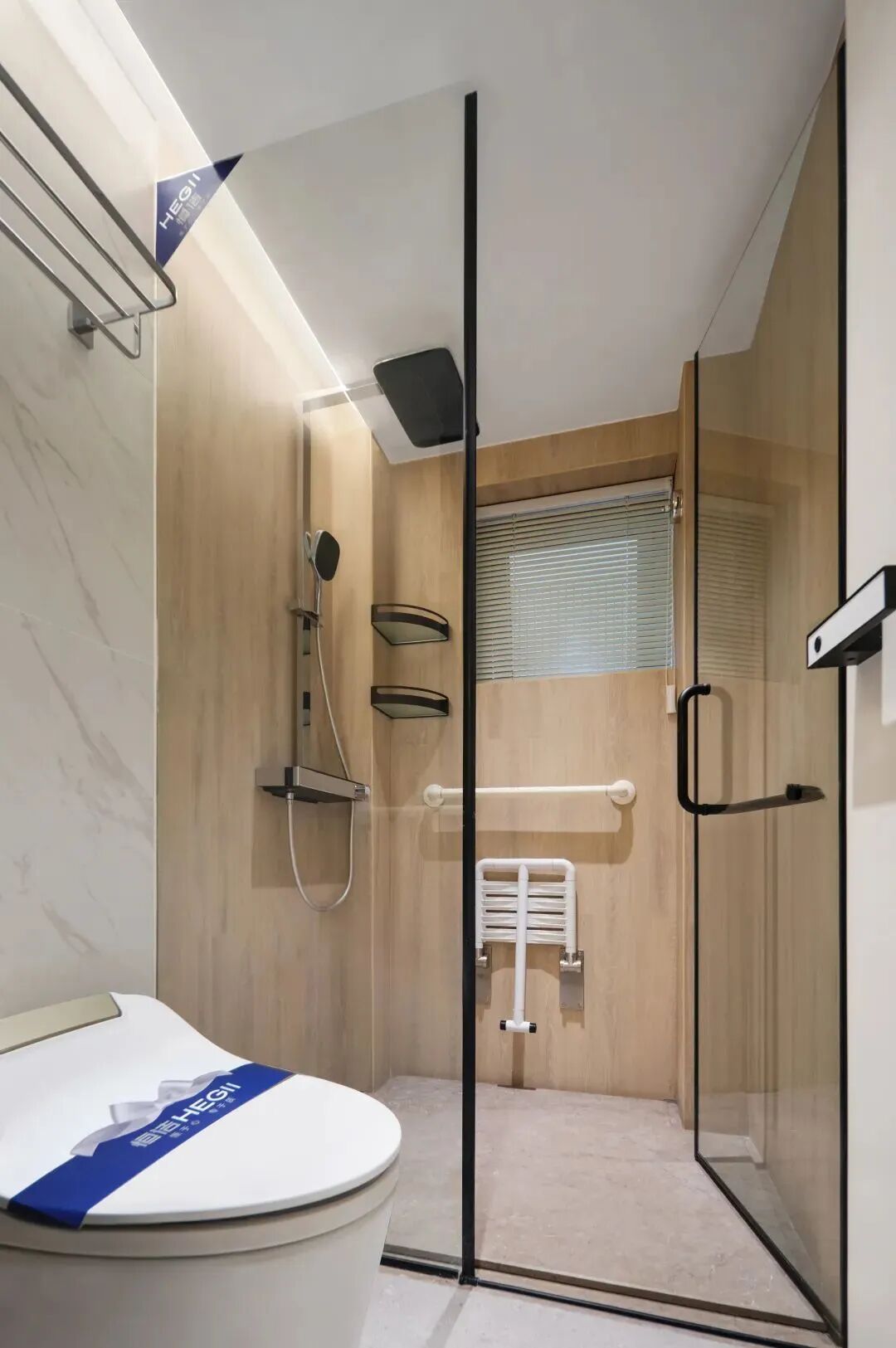 厨房旁边就是原来的卫生间区域,干湿分离的设计,让一家人使用起来更加安全舒适。淋浴房内也安装了扶手等适老化设施,方便年事已高的外公外婆。