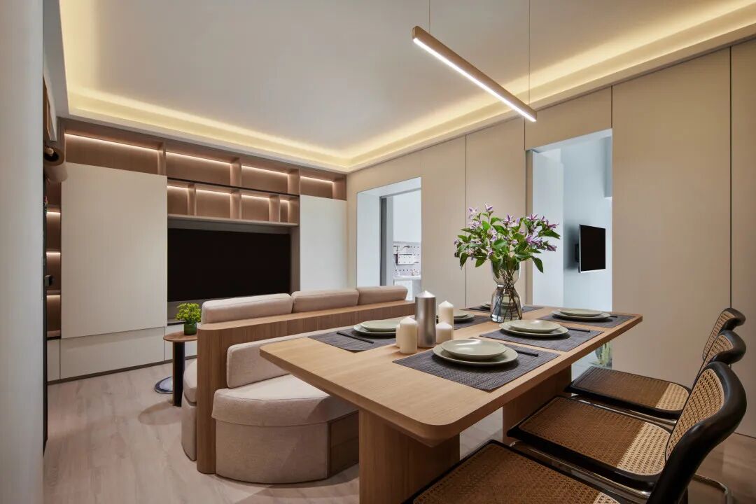 餐桌的另一侧是一个多功能的组合沙发,一面可以当成餐椅,另一面坐着看电视,中间的台面不仅可以置物,也配备了专门的充电区。