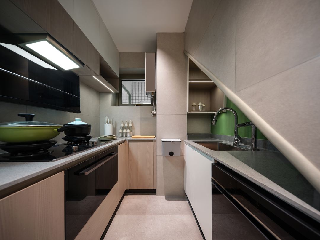 厨房比之前大了不少,设计师利用楼梯下方的空间做出一个洗菜池,极大提高了空间利用率。因为这里有一个斜角,所以还特意安装了防撞条。