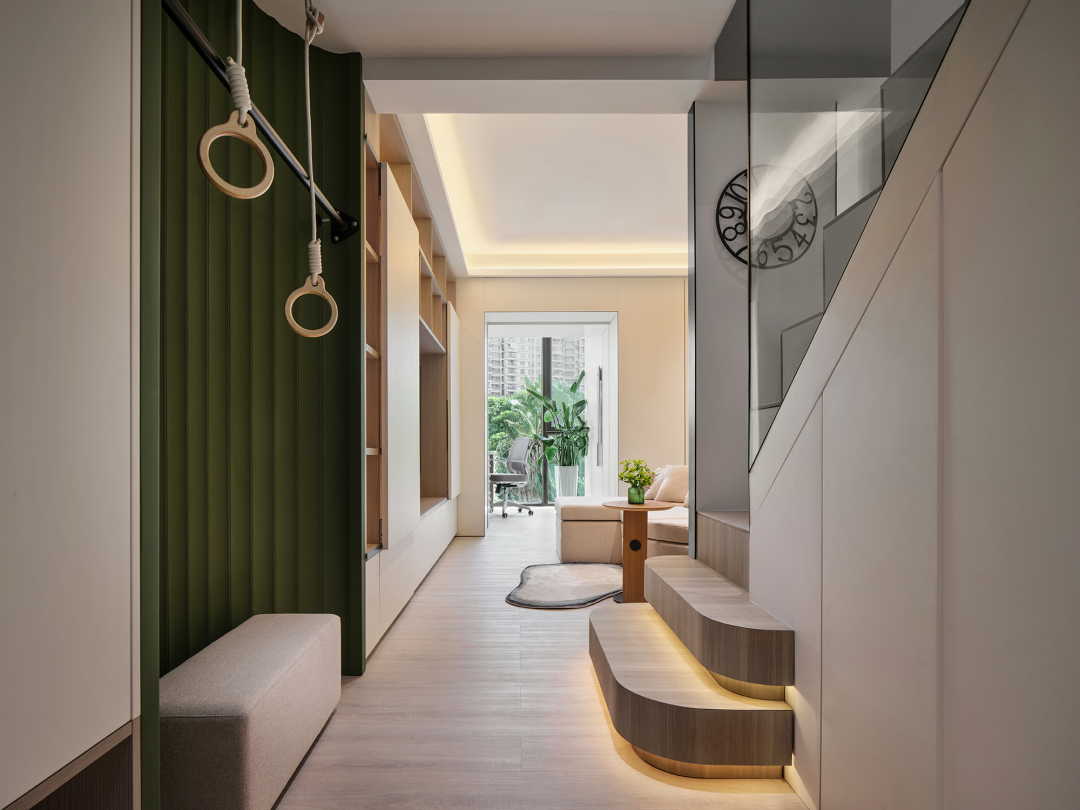 换鞋凳的上方,设计了一个训练用的拉环和单杠,让游游不用外出,也能在家锻炼。