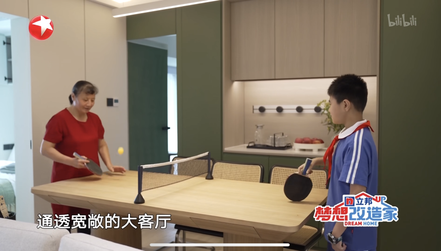 不用餐的时候,餐桌还可以变成一张乒乓球桌,游游和外婆终于不用对着大床打乒乓球了。