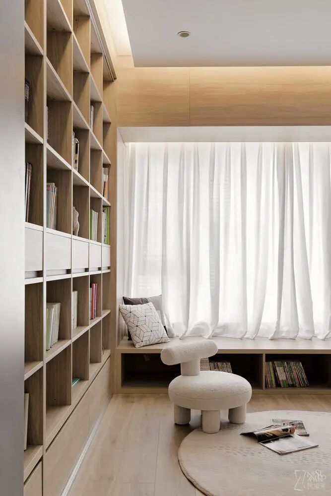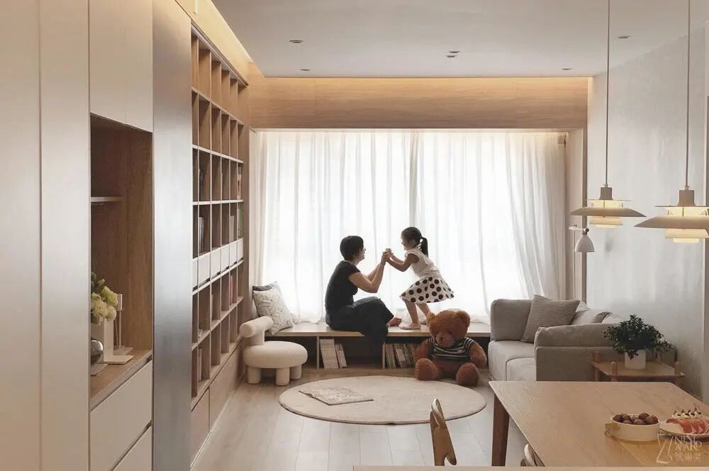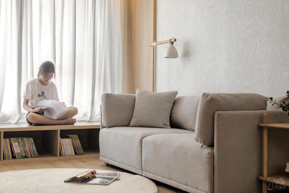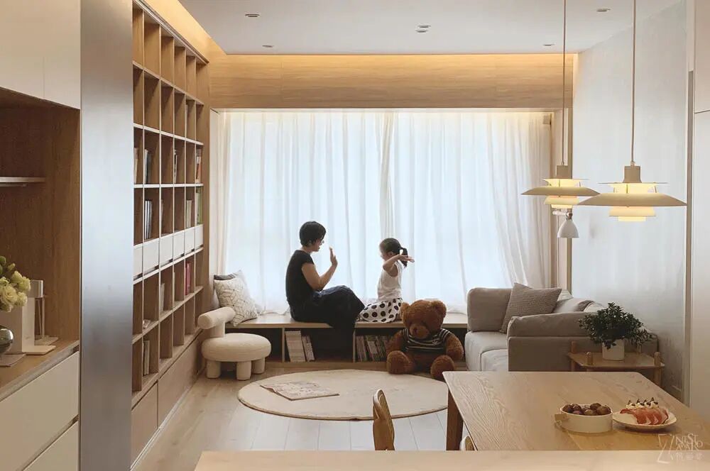 在阳光充足的地方,打造一个可储物的多功能地台。闲时,妈妈和妹妹在这儿玩耍;姐姐在这儿学习;爸爸在这儿工作;除此之外,冬天还可以在这儿晒晒太阳,喝一杯热茶。
