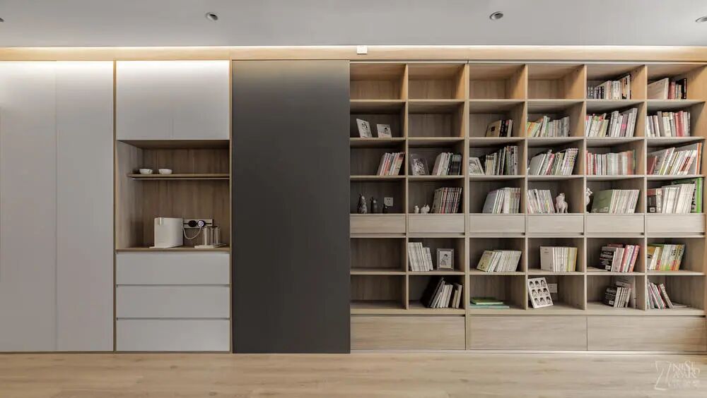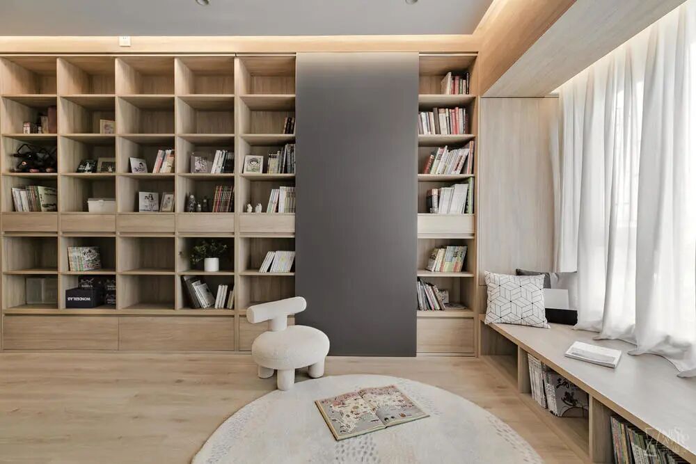 去掉传统的电视背景墙,一面书墙不仅散发着浓浓的书香气息,还成为公共空间的亮点所在。书柜的推拉门采用黑色烤漆板,孩子们可以在这里涂涂画画,实现自己的天马行空。