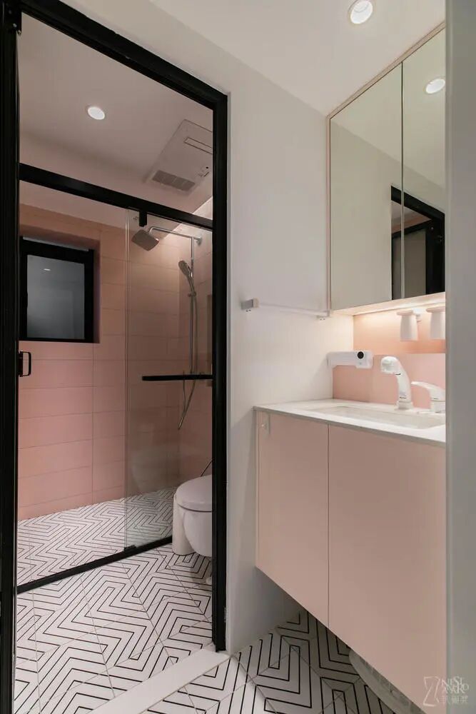 卫生间采用同色系的粉色,黑色边框简洁又个性,使整个空间的时效性得以延长,即使孩子大一些了同样毫不违和。