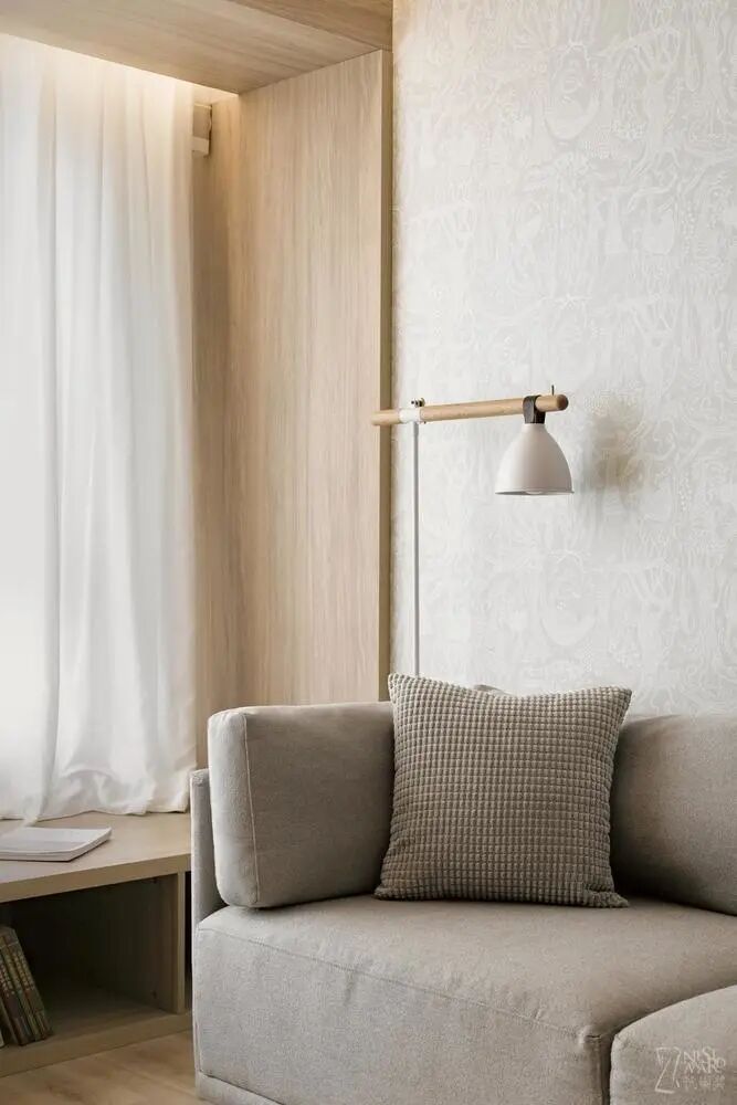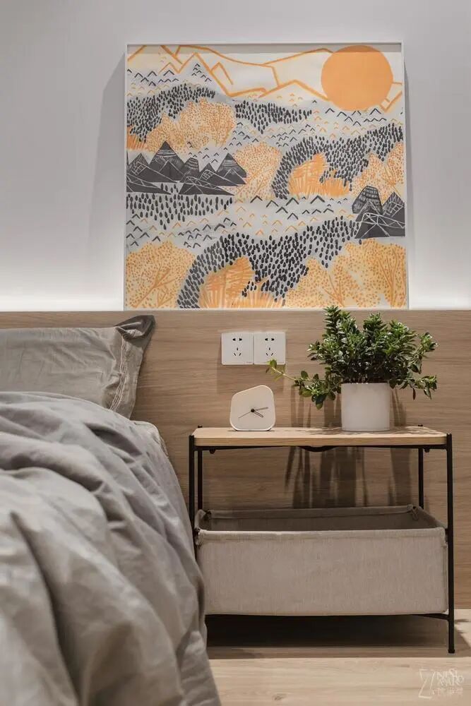 床头是一个简易置物架,也可以作为床头柜使用,随手放一些小物件,下面布艺的部分还可以储物,十分方便,又与整体达成和谐。