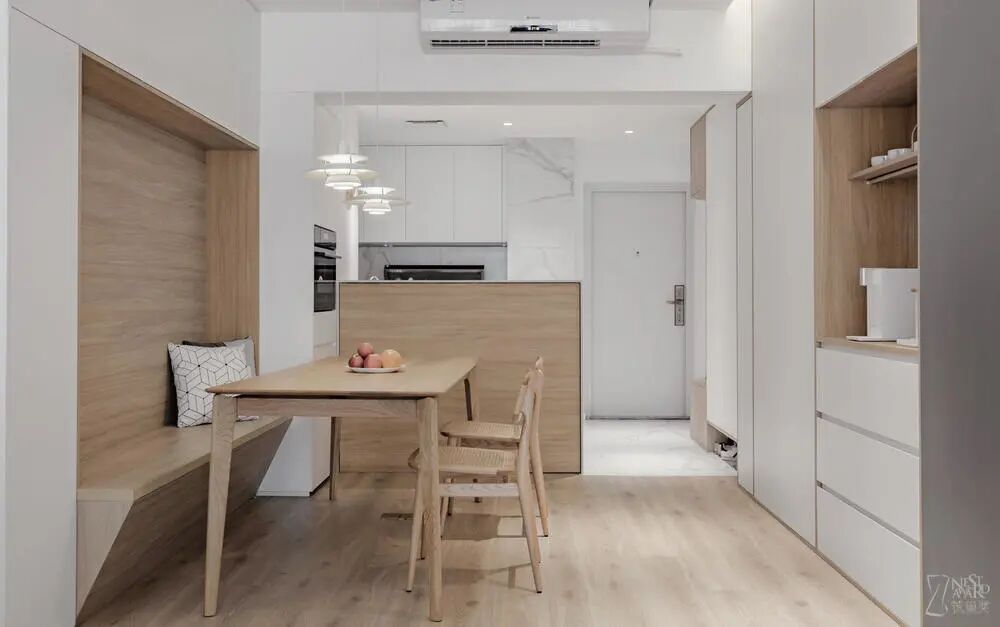 光的色温控制得刚刚好,归家后用柔和的灯光包裹自己。改造前,这儿是一个狭小的玄关以及封闭的厨房;改造后,设计师把原本阻隔玄关、厨房、客厅空间的墙体拆除,最终打造一个更加开放、通透一体的空间。