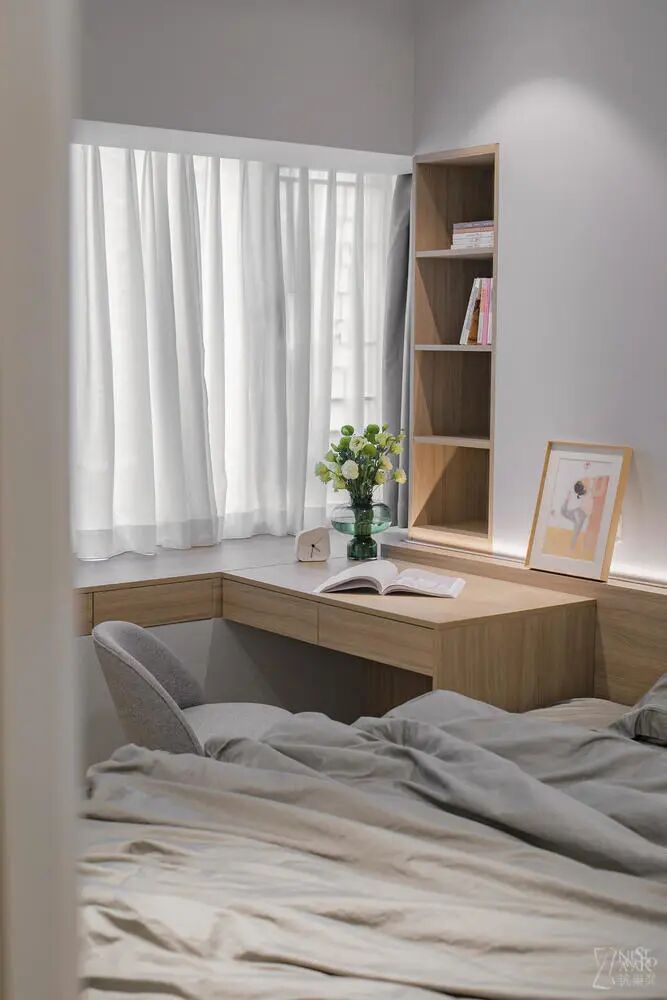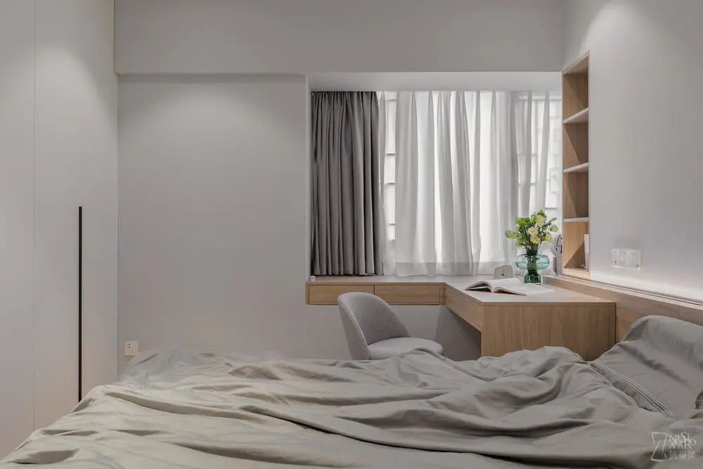 主卧以简约为主,经典的白、木、灰色调完美诠释一个静谧的空间。护墙板的设计减少了床头靠垫的空间使用,沿窗边打造一体的书桌+柜子,让整体的设计更加偏向实用性。