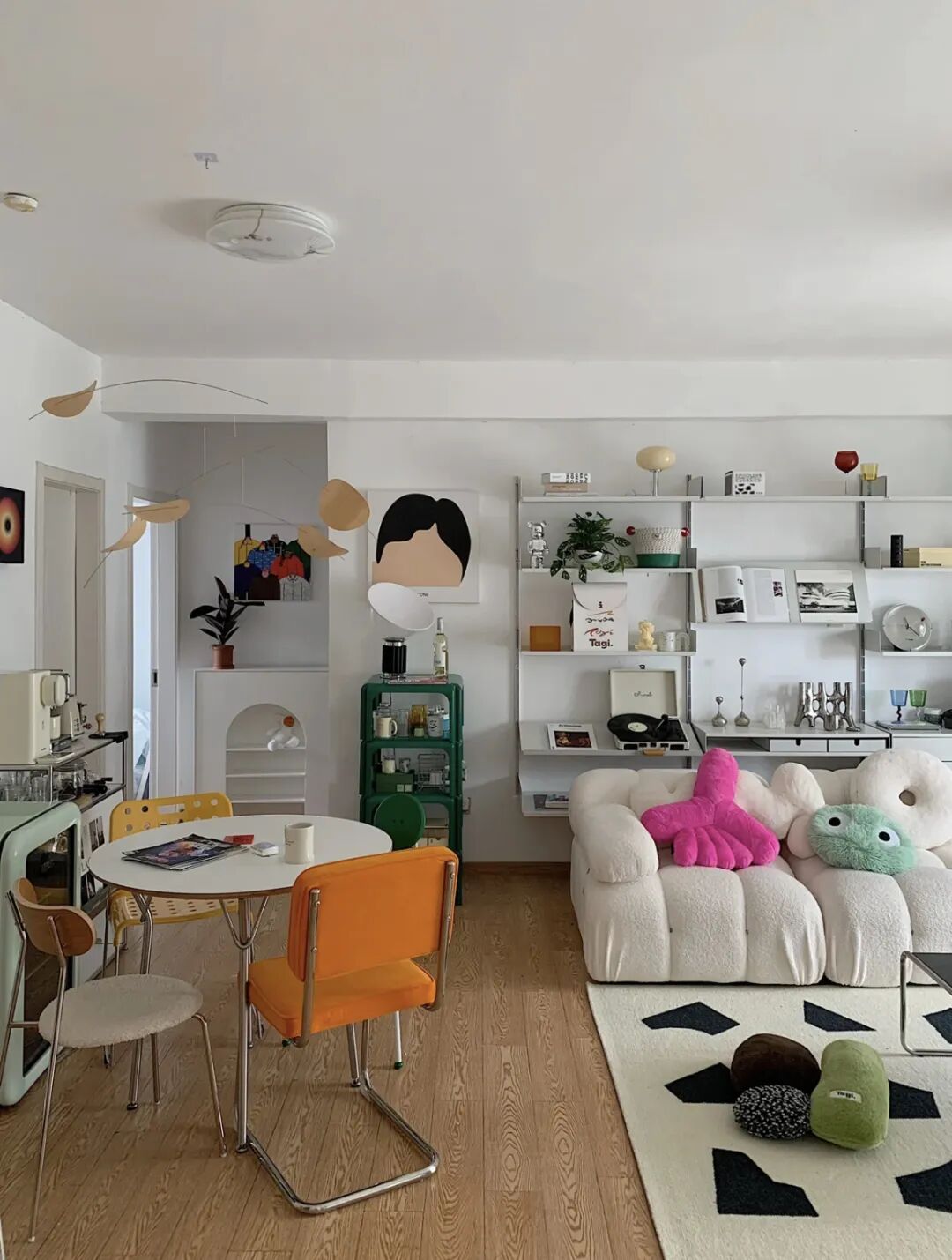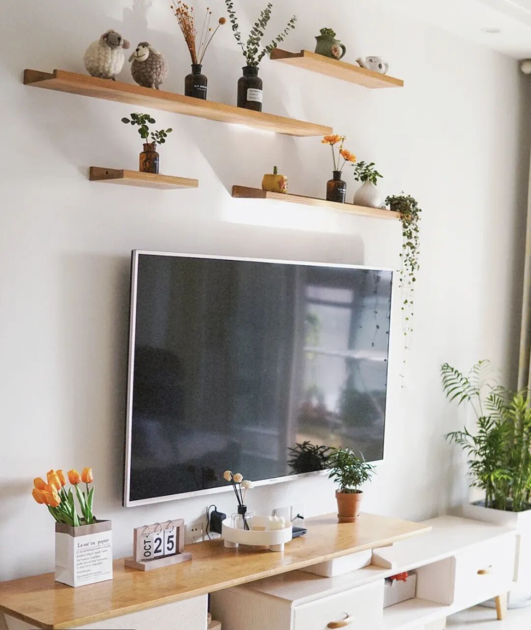 如果觉得都放在地面上比较逼冗,也可以在墙上做功夫。几个简单的隔板瞬间氛围感就上来了,而且安装带凹槽的隔板,放一些小东西也不会显得杂乱。