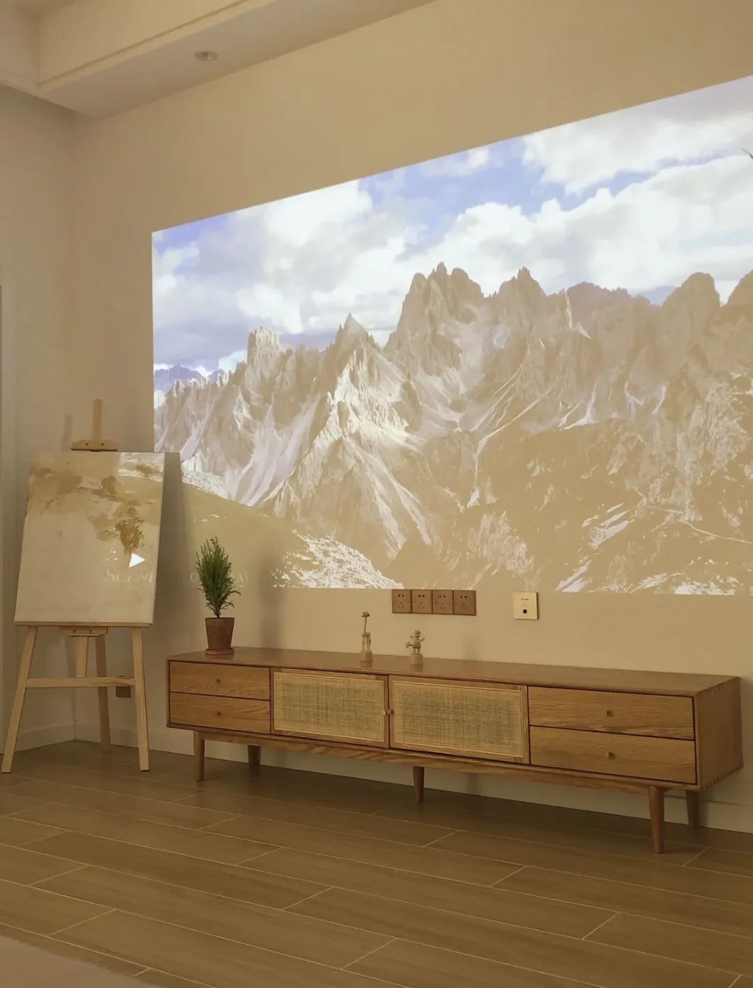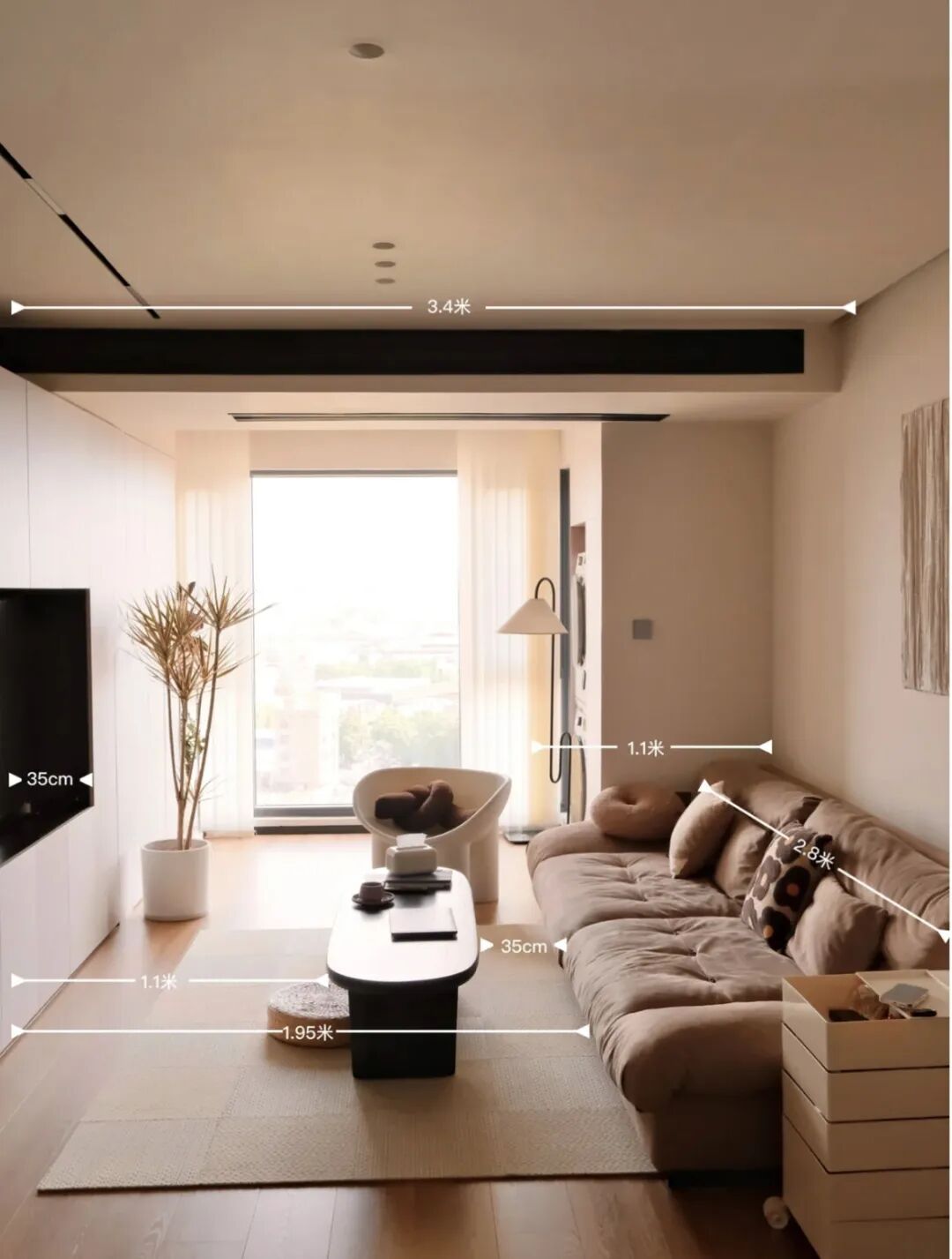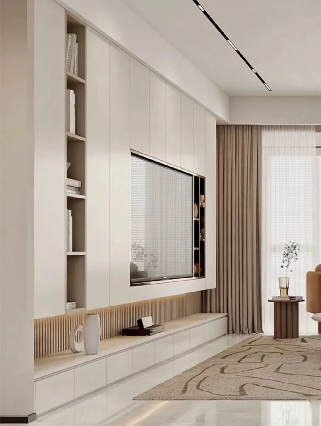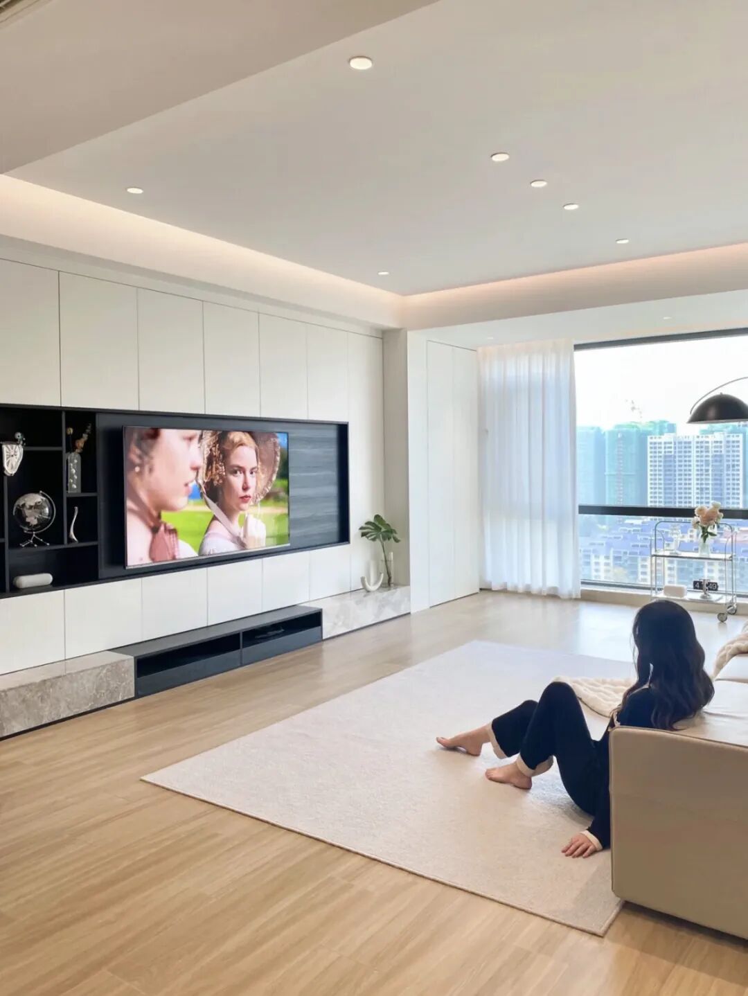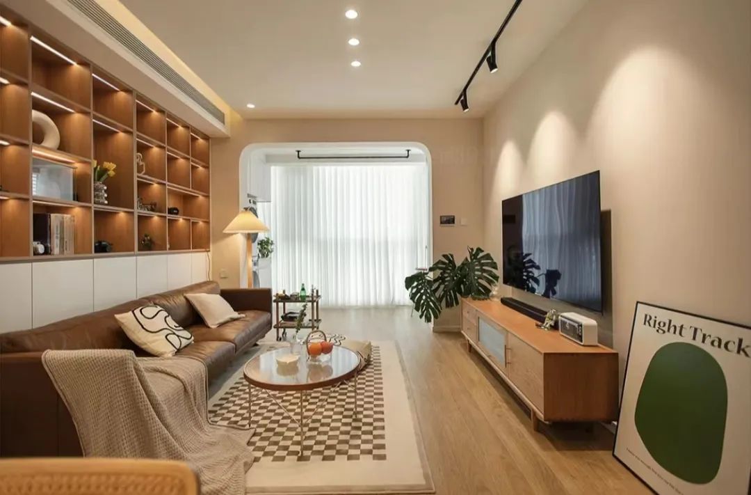 但是要注意满墙电视柜对空间有一定要求,客厅开间低于3.6m以下不建议, 太压抑。人坐在沙发上至少也要距离电视有1.8m的距离,而且留电视格,装电视的格子要打底15cm,可以避免深远感。