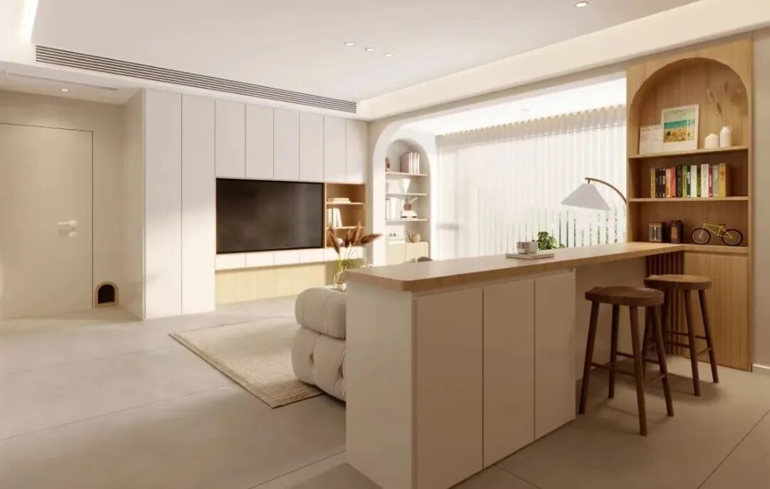 内部设计与满墙储物柜类似,电视柜的深度建议在30cm上下,内部分区设计。如果空间不足,电视背景墙是非承重墙的话,可以将墙打掉,取而代之。