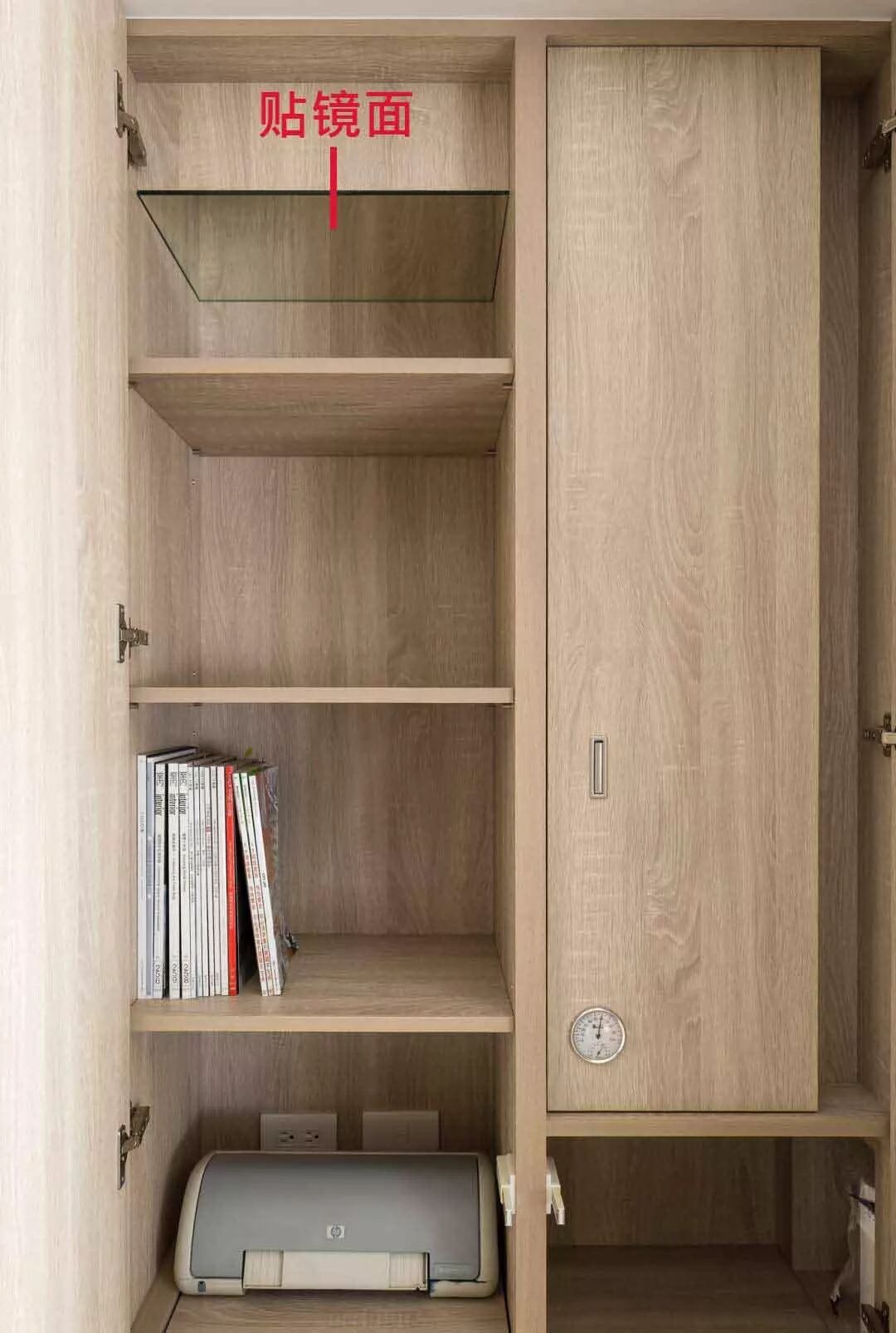 不妨在柜板顶端贴个镜面试试,透过镜面反射,一打开门就能看见顶层放置的物品,不会忘记你收纳了什么,也能更精确找到你需要的物品,简直太机智了!