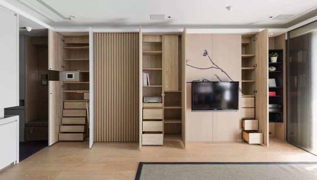 收纳空间是有了,但这样的设计却有个小瑕疵:最上层的柜子拿不到,也看不到放了什么物品。拿取时就只能搭椅子或搭梯子,时间久了就会嫌麻烦而放弃拿取,上层物品就会彻底闲置积灰。